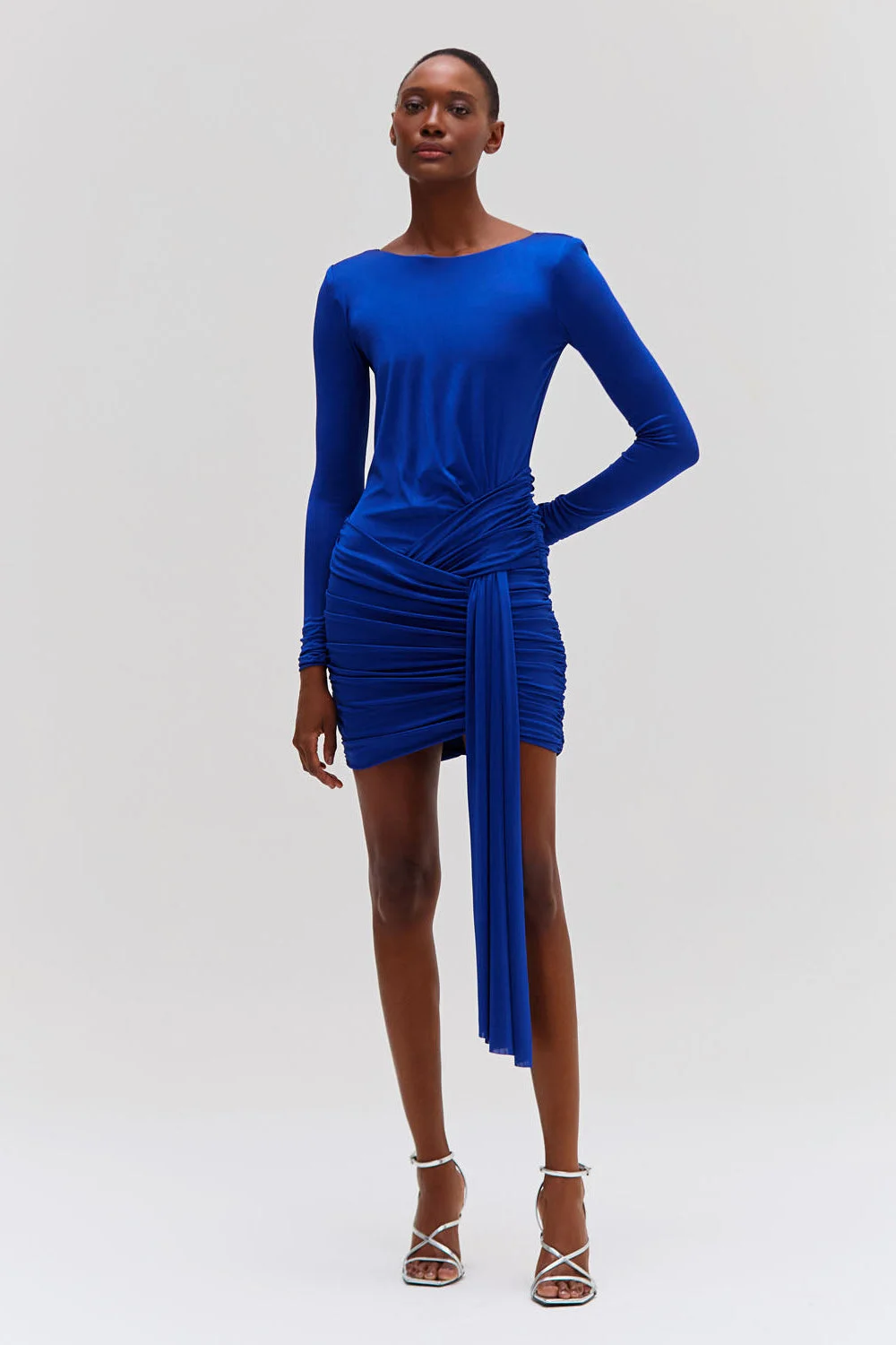 ALL SALE ITEMS ARE FINAL SALE. NO EXCHANGES OR RETURNS. Metallic Jersey Long Sleeve Mini Dress features a tight-fitting silhouette with ruched mini skirt detail and dramatic side draping. Runs large. Made in China. 95% Polyester 5% Elastane. VEC29458US
