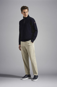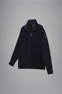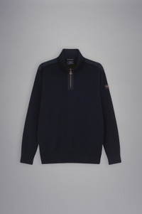 DETAILS High neck with zip Technical fabric inserts Bretagne wool half zip sweater with iconic badge Long sleeves Regular fit Product ID: C0P1033 COMPOSITION & CARE Composition: 100% Wool