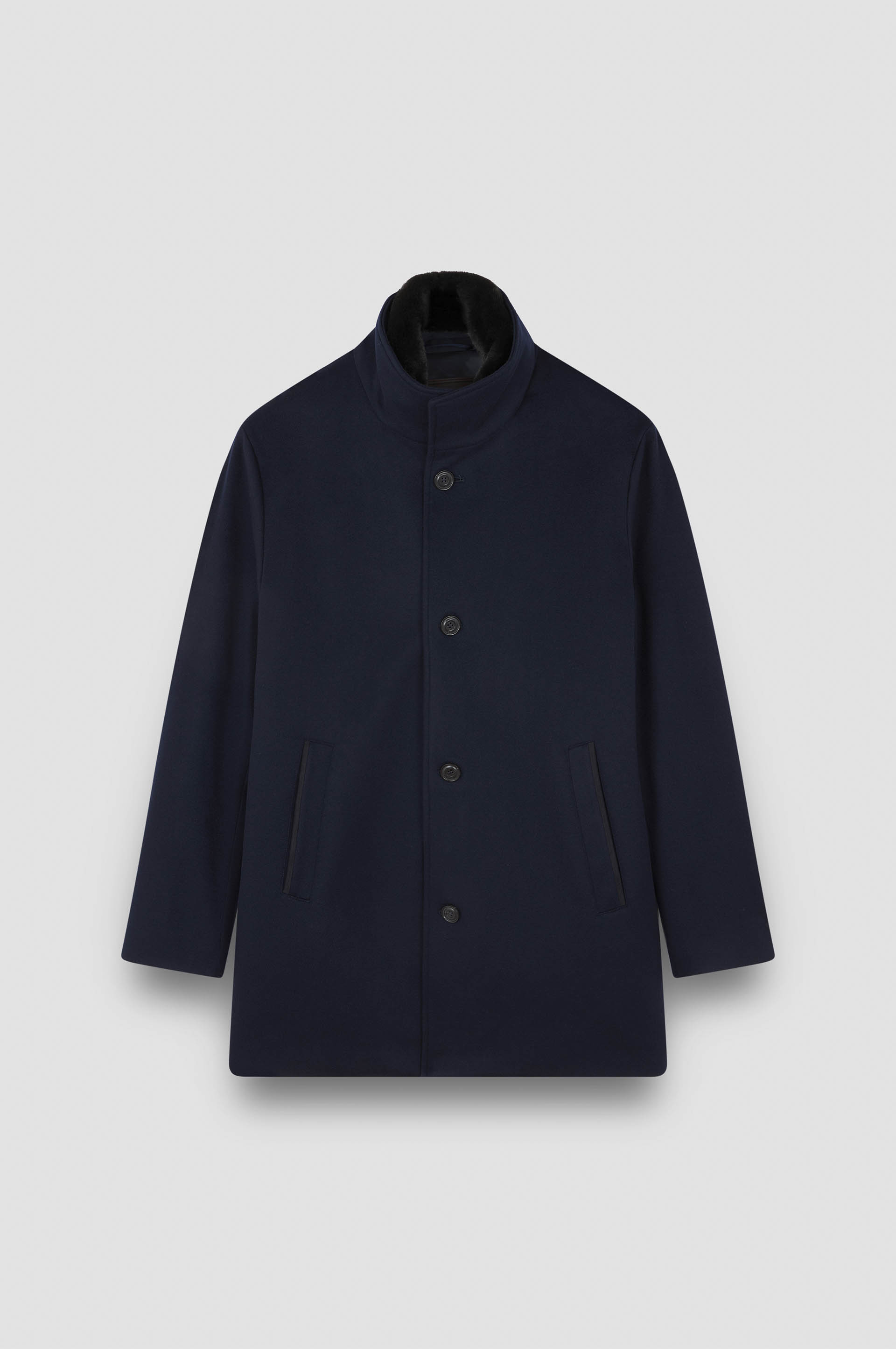 Dedicated to business meetings and formal occasions, this car coat is a timeless essential that no men’s wardrobe is complete without. Its elegant silhouette is enriched with a faux fur collar and detachable padded bib, making it endlessly versatile for all weather conditions. Refined yet practical cashmere fabric sets it apart from the rest, produced in Italy with Loro Piana's Green Storm System®: a Loro Piana registered trademark that makes the fabric waterproof and wind-resistant, without altering the softness or comfort of the natural fibre. DETAILS Metal Shark Fin Collar in eco-fur Button closure Carcoat in cashmere Storm System® Made in Italy by Loro Piana® Welt pockets with tone-on-tone suede trim Small internal pocket Removable padded bib Regular Fit Product ID: 15312418 COMPOSITION & CARE Composition: Outer: 100% cashmere - Lining: 55% polyester, 45% viscose - Padding: 100% polyester - Removable front part: 100% polyester