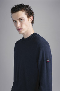 DETAILS Moon badge Garment dyed Crewneck Sweater in gauge 12 wool Ribbed collar, cuffs and flounce Jersey knit Product ID: 11311001 COMPOSITION & CARE Composition: 100% Virgin Wool