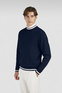 RE-CODED translates the charm of Paul & Shark’s historic archive into a range of timeless, sophisticated looks. Iconic details, super-soft yarn and modern proportions: this crew-neck jumper brings statement Paul & Shark style to your everyday wardrobe. This garment is knitted from wool and treated with Soft Cool Touch technology: the yarn is cold-pressed to create a super-compact yet flexible texture that’s resistant to pilling and makes water slide right off the surface. Ribbed trims ensure a well-defined silhouette, detailed with a contrast stripe in Paul & Shark’s signature palette. DETAILS Shark label Soft Cool Touch wool crewneck sweater fineness 8 Ribbed collar, cuffs and flounce Stocking stitch Long sleeve Regular Fit Product ID: 15311090 COMPOSITION & CARE Composition: 100% virgin wool