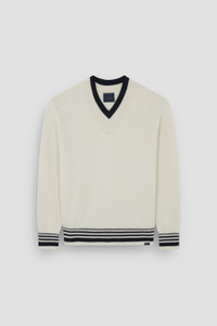 Re-Wool is an innovative and sustainable fabric made from recycled wool, blending craftsmanship with modernity. Its rich texture and hand-embroidered-like surface make it ideal for garments with a refined and conscious design. A responsible choice for collections that stand out for their style and environmental awareness. Elevate any look with timeless style and meticulously selected yarn. This jumper is knitted from Re-Wool: a blend of cosy regenerated fibres that cements Paul & Shark’s commitment to circular consumption. Its silhouette is edged with contrast stripes on the V-neck, cuffs and hem as a subtle nod to the sailing world. DETAILS Shark label Sweater in Re-Wool fineness 5 with contrast-trimmed V-neck and striped pattern on cuffs and hem Ribbed collar, cuffs and flounce Stocking stitch Long sleeve Regular Fit Product ID: 15311070 COMPOSITION & CARE Composition: Outer: 80% Wool 20% nylon