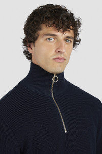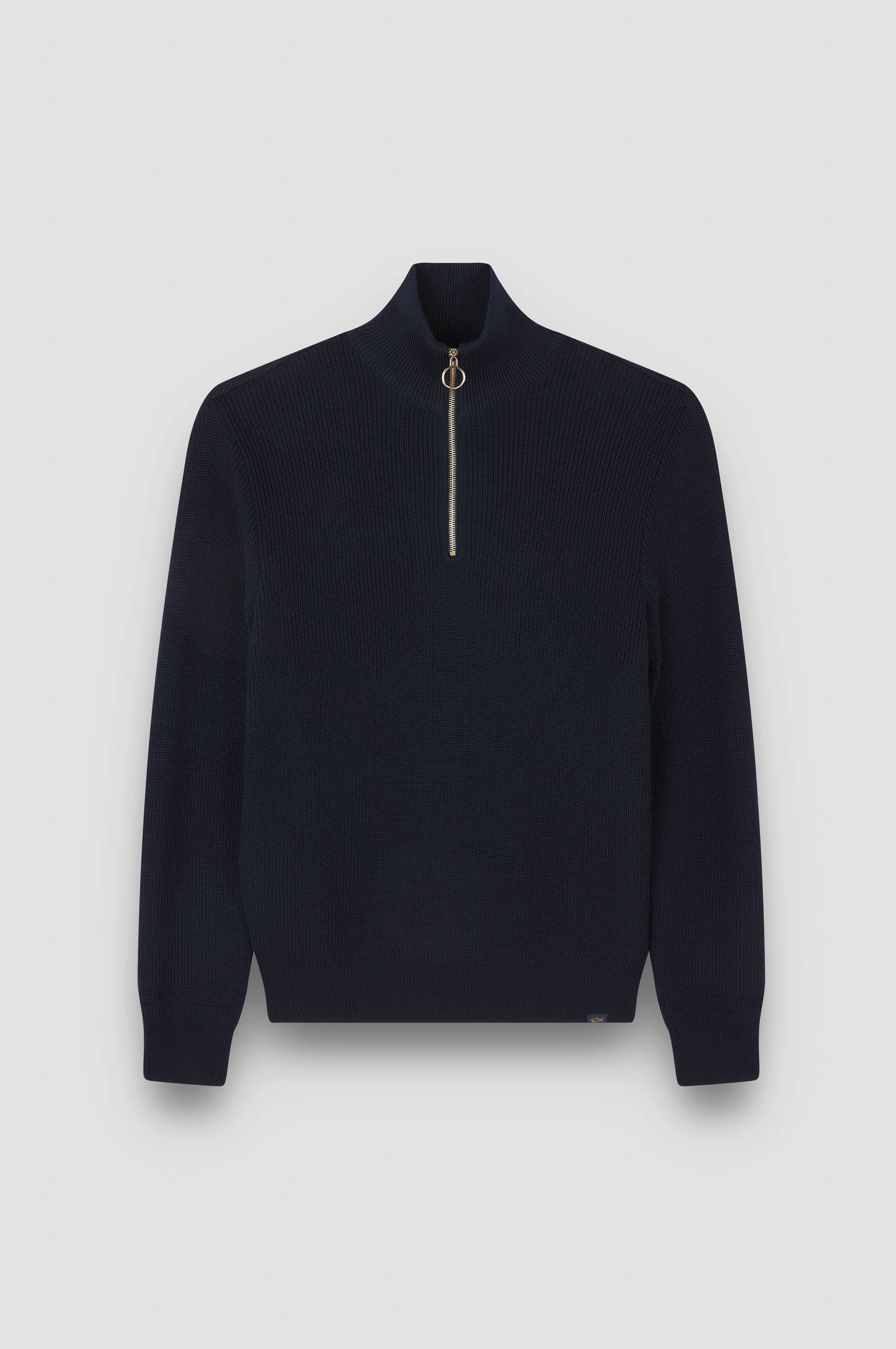 Paul & Shark draws inspiration from the past to create timeless collections that always feel new. Over the years, some pieces have become true icons, instantly recognizable in both design and style. Perfect for off-duty outfits and city errands, this jumper is crafted from a soft and breathable technical wool blend, knitted with a chunky ribbed texture that pays homage to Paul & Shark’s sailing origins. Its high-neck design is warm and cosy, featuring a circular metal zip pull and ribbed trims that gracefully flex to your every movement, while maintaining the elegant proportions of the silhouette. DETAILS Shark label Zip closure Tech Wool half-zip sweater fineness 8 Ribbed collar, cuffs and flounce English rib knit Long sleeve Regular Fit Product ID: 15311168 COMPOSITION & CARE Composition: Outer: 50% Virgin Wool 50% Acrylic