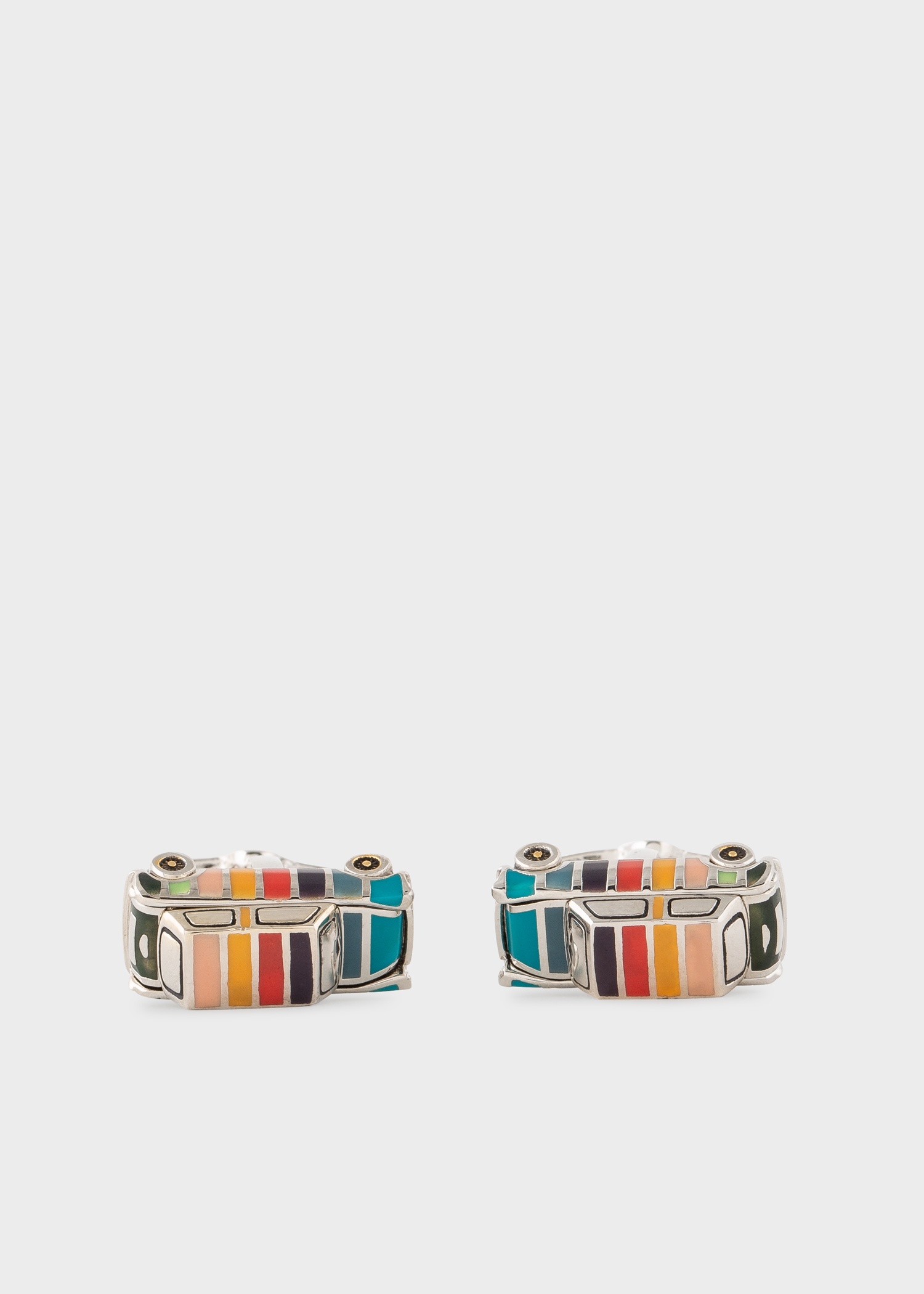 These cufflinks feature a mini-car, with our signature 'Artist Stripe' pattern throughout. Complete with a polished silver finish and Paul Smith signature embossed T-bar fastenings. 90% Copper, 10% Zinc, 100% Enamel Plating Product Code: M1A-CUFF-AMINIC-97
