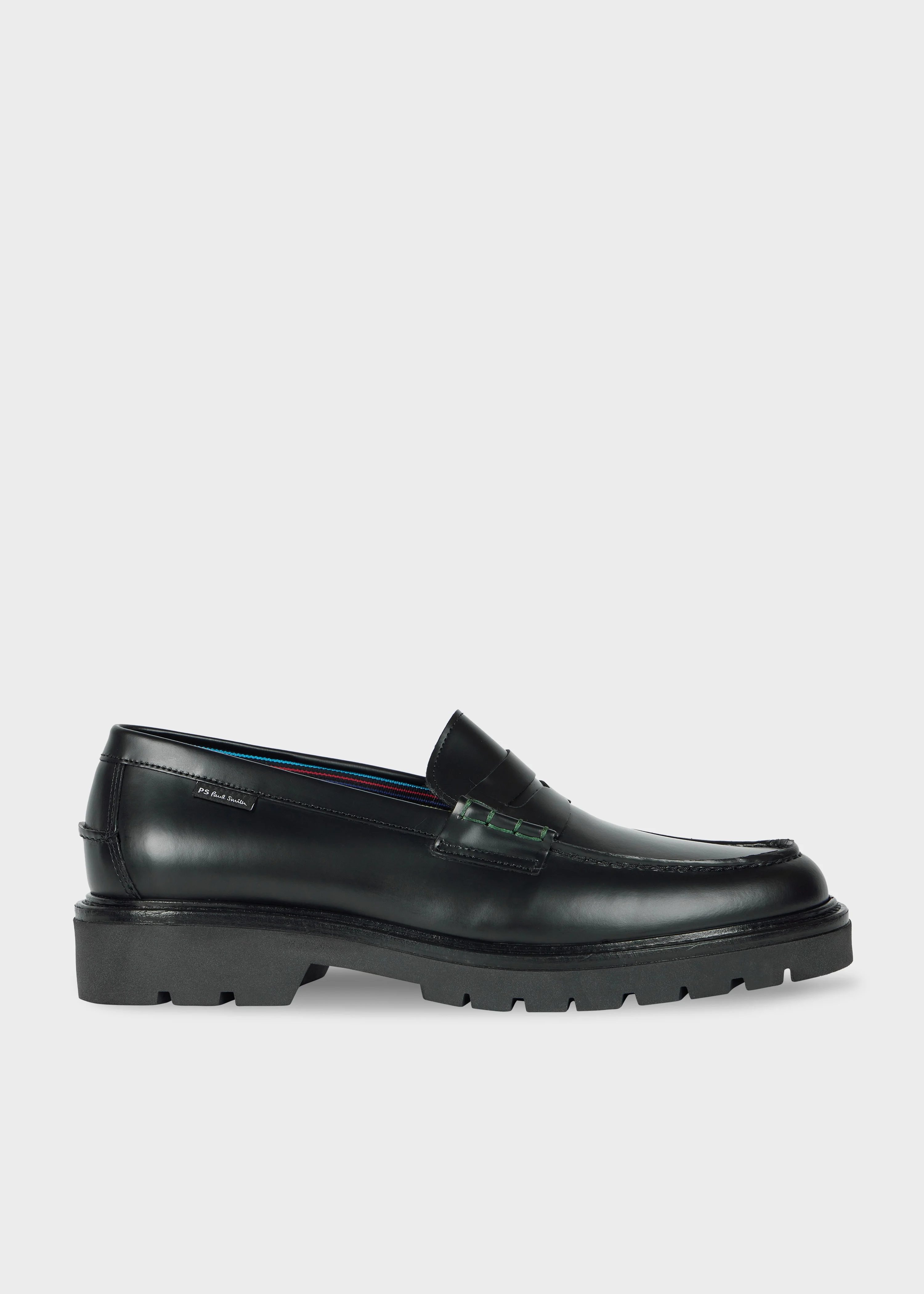 Made in Portugal from premium leather uppers, these black 'Bolzano' loafers feature a classic design with EVA soles for a lightweight finish. Complete with a beef-roll stitched saddle detail and a zebra pattern outsole. Product Code: M2S-BOL10-PLEA-79