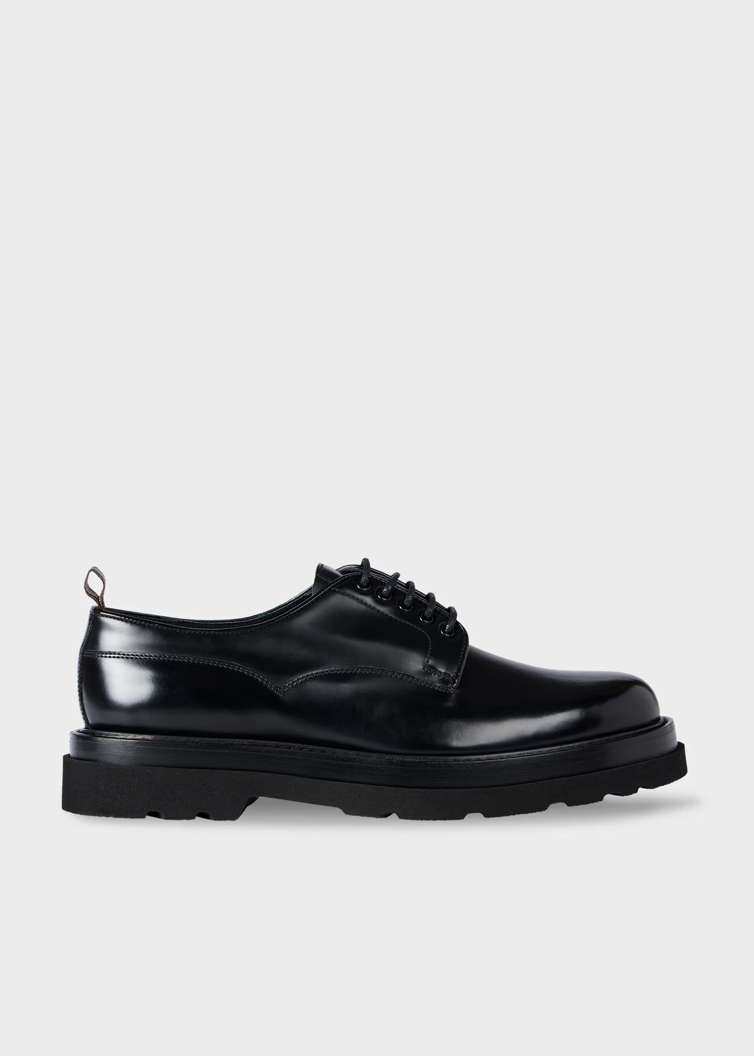Made in Italy from premium high-shine leather uppers, these black 'Godwin' shoes feature a classic Derby shape. Complete with EVA and rubber mix soles for a lightweight finish, these shoes are finished with 'Signature Stripe' heel pulls for functionality. Product Code: M1S-GOD01-THSH-79