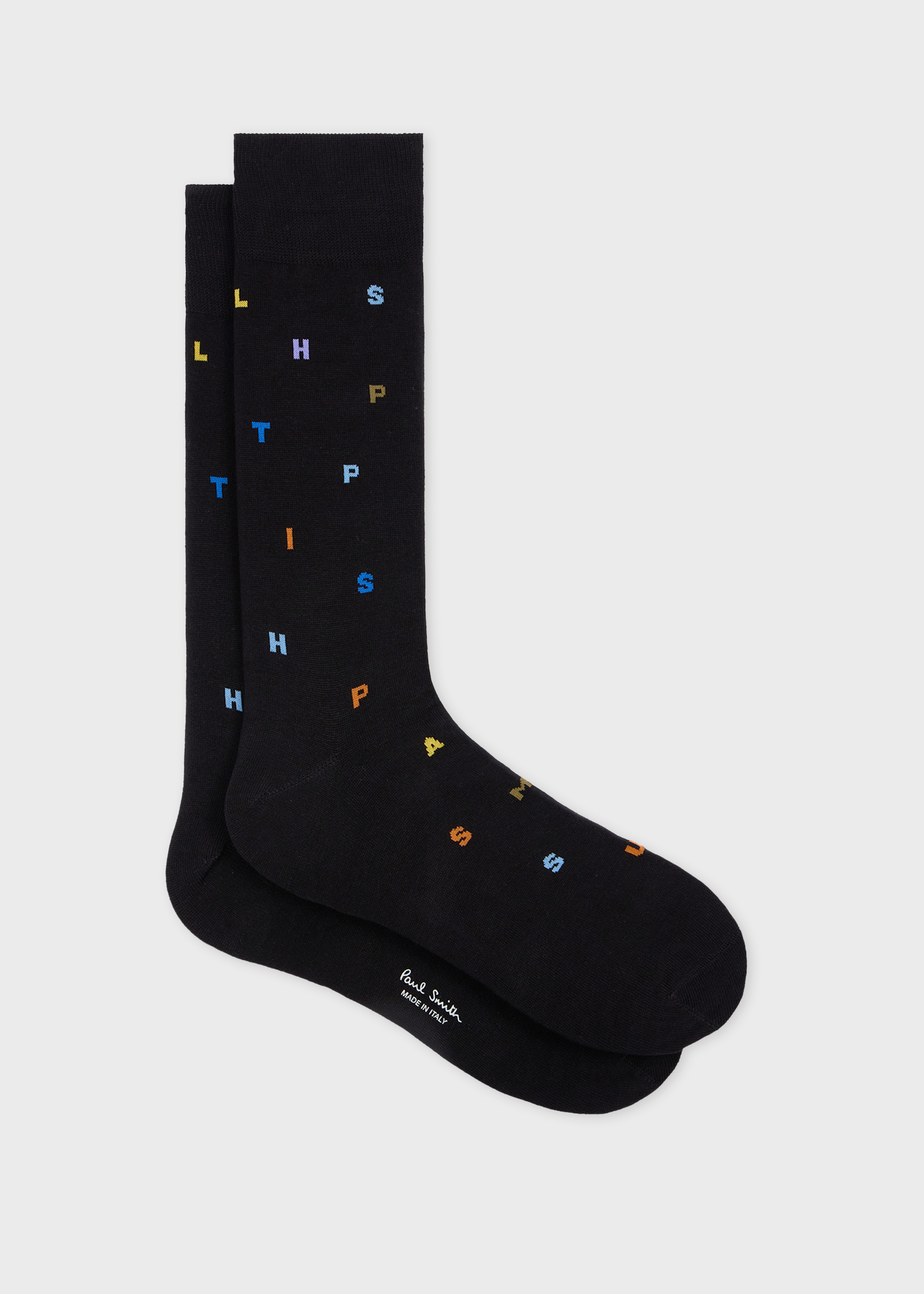 Made in Italy from an organically grown cotton blend with added stretch, these black socks feature a contrast multicolor logo letter 'Stamp' design. The socks are complete with block heel, toe, and ribbed trims. 80% Cotton, 18% Polyamide, 2% Elastane Machine washable Made in Italy Product Code: M1A-800MO-T584-79