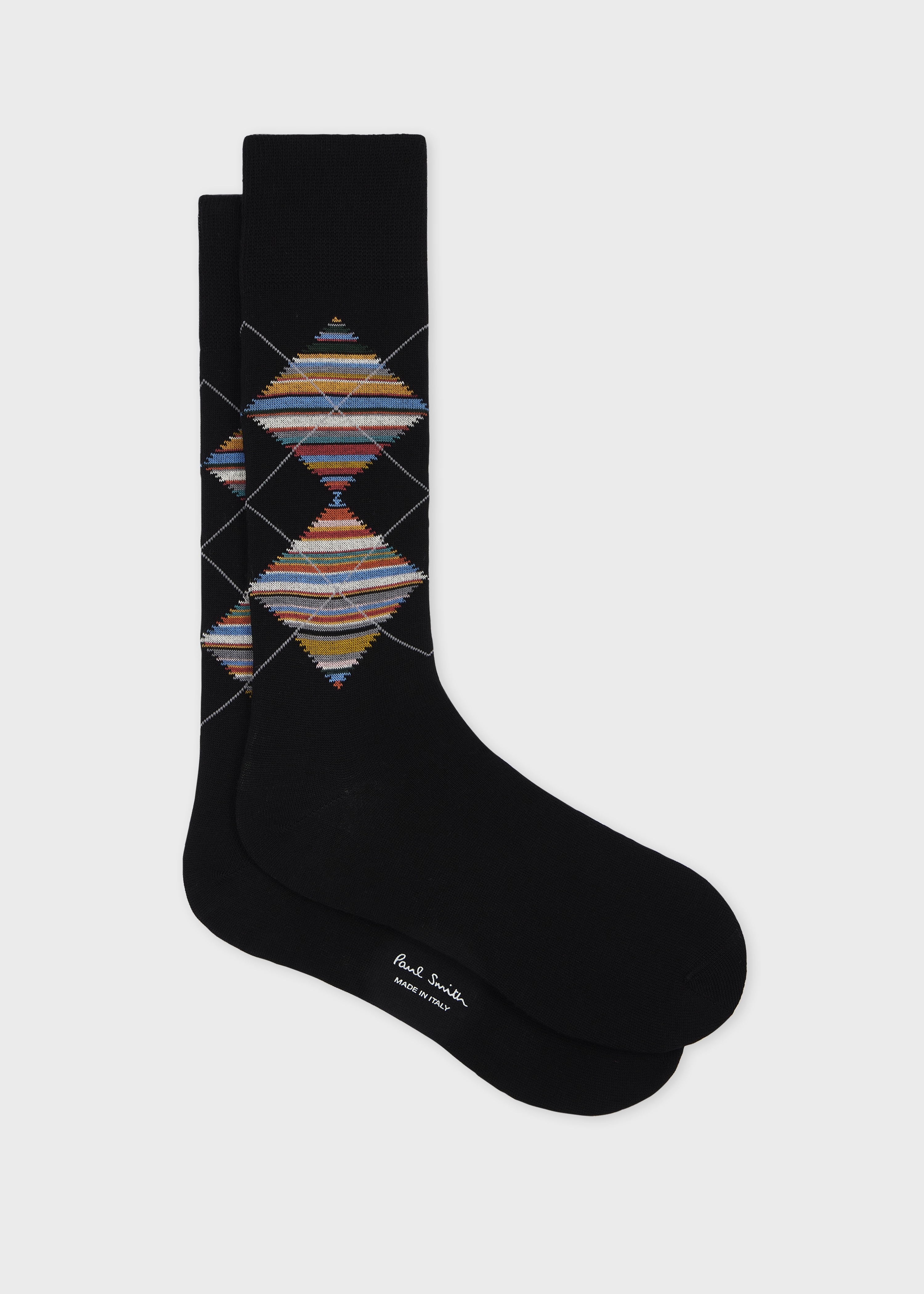 Made in Italy from a soft cotton-blend for comfort, these black socks feature a classic Argyle pattern with our 'Signature Stripe' providing a flash of colour. 84% Cotton, 15% Polyamide, 1% Elastane Machine washable Made in Italy Product Code: M1A-380CI-T577-79