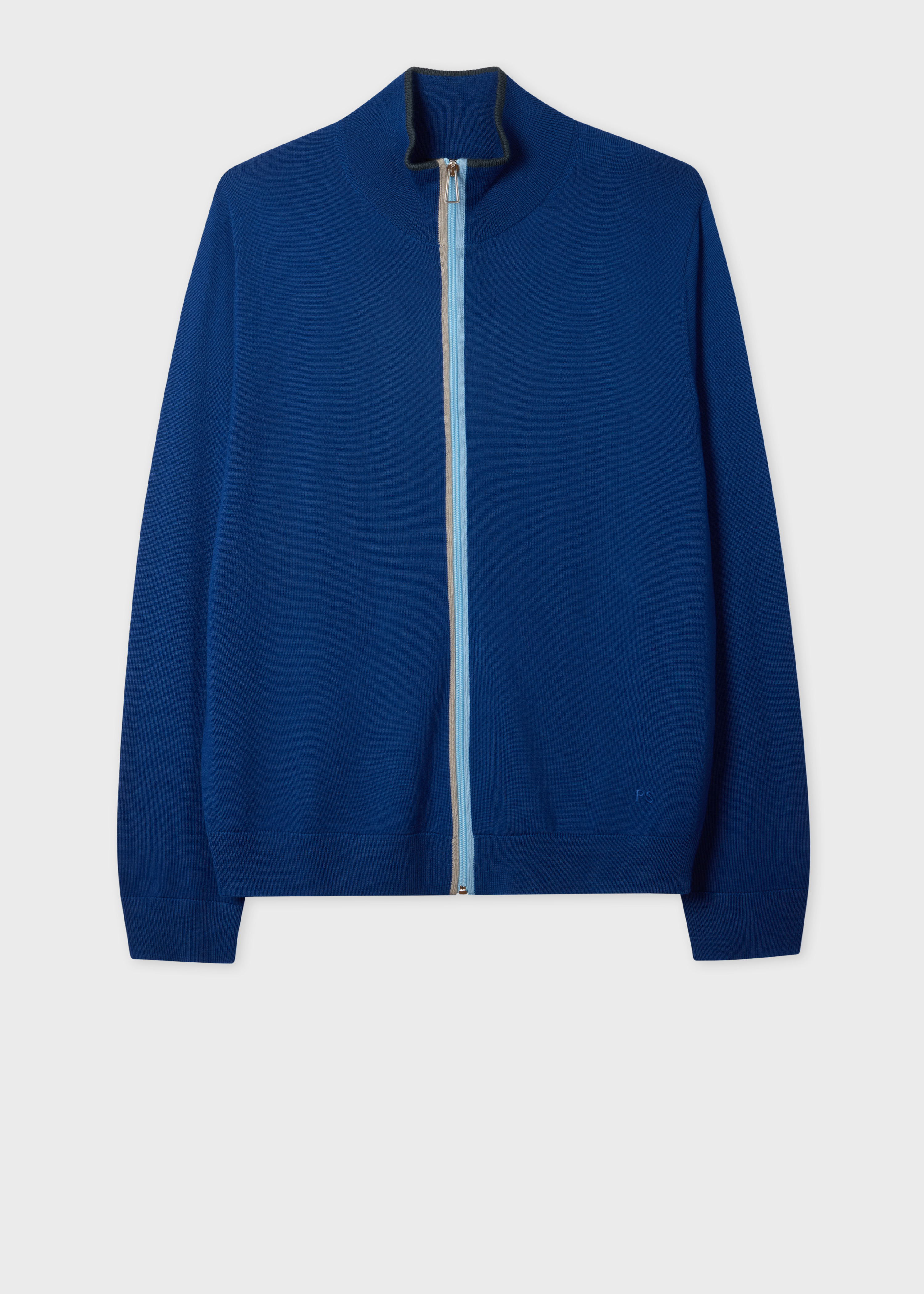 Made from merino wool for a soft, lightweight, and breathable finish, this blue cardigan features a full-zip design with a ribbed funnel neck. Complete with two-colour stripe detail on either side of the zip, this cardigan is finished with tonal embroidered PS initials at the hem. The Fit - Regular-Fit is relaxed through the body. Product Code: M2R-814Z-R22610-45