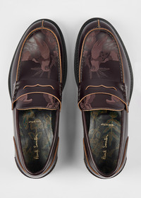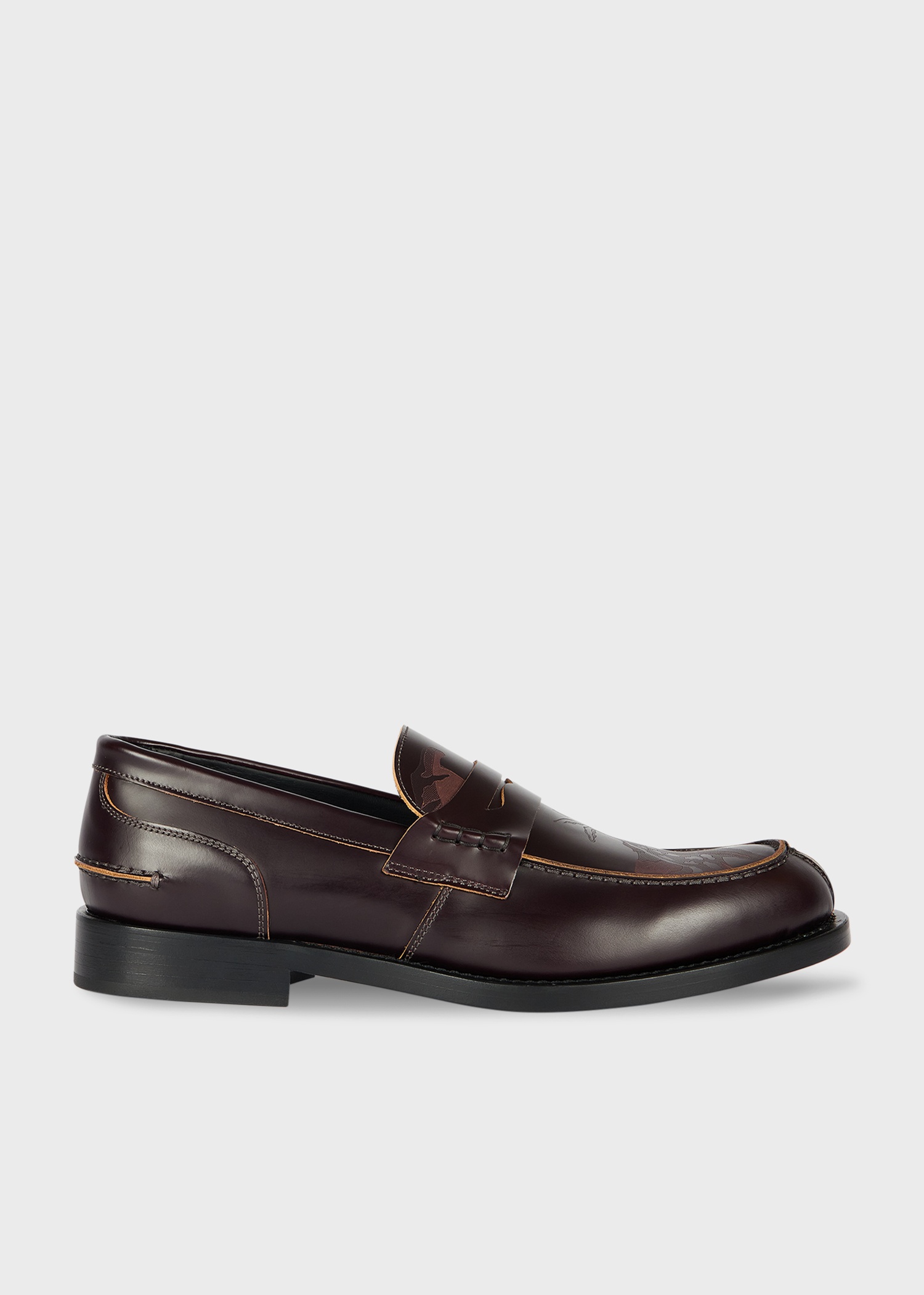 Made in Italy from premium high-shine leather, these Bordeaux 'Donovan' loafers feature a 'Lucky' penny detail inside the saddle cut out - for an added twist. Finished with a tonal 'Bohemia' pattern on the toes, contrast edges and tonal leather soles. Product Code: M1S-DON02-THSH-28