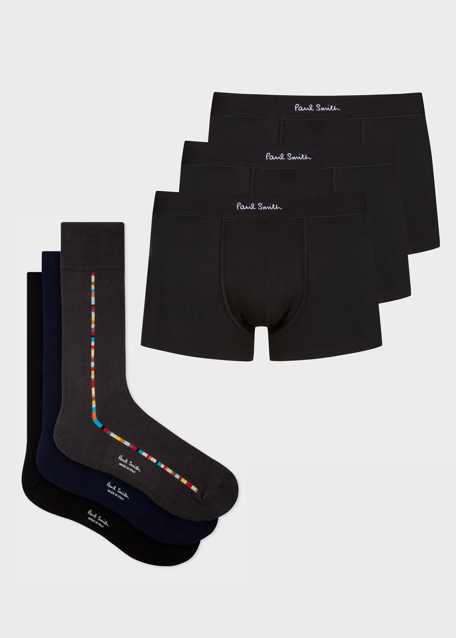 Presenting Paul Smith gift sets, specially curated gift sets presented in a Paul Smith box and gift wrap, making it easier to treat you or a loved one during the holiday season. This gift set includes: [b]Organic Cotton Black Low-Rise Boxer Briefs Three Pack[/b] Crafted from a soft organic cotton-blend, this pack of three low-rise boxer briefs feature a plain black design with tonal Paul Smith signature waistband. Updated for Autumm/Winter 2023, our best-selling boxer packs are now made using an organic cotton. 94% Cotton, 6% Spandex Machine washable [b]Central 'Signature Stripe' Socks Three Pack[/b] Made in Italy from a soft cotton-blend, this three pack of men's socks features a navy, grey and black pair - each with a central 'Signature Stripe' pattern. Presented in an 'Artist Stripe' gift box. One size 80% Cotton, 18% Polyamide, 2% Elastane Machine washable, wash inside out Made in Italy Product Code: M1A-ECOMM-NGIFT8-00