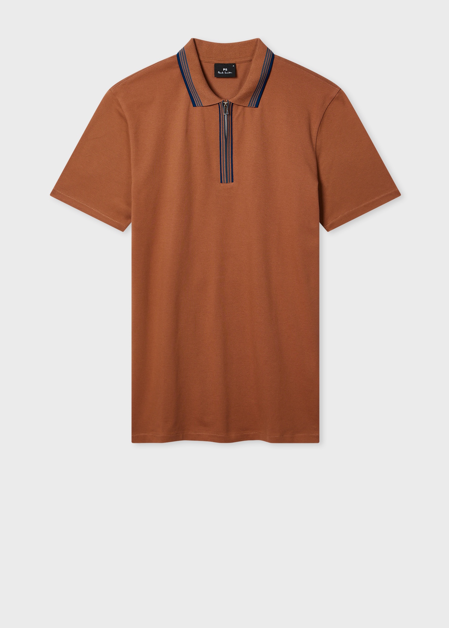 Brown Contrast Tipping Zip-Neck Polo Shirt