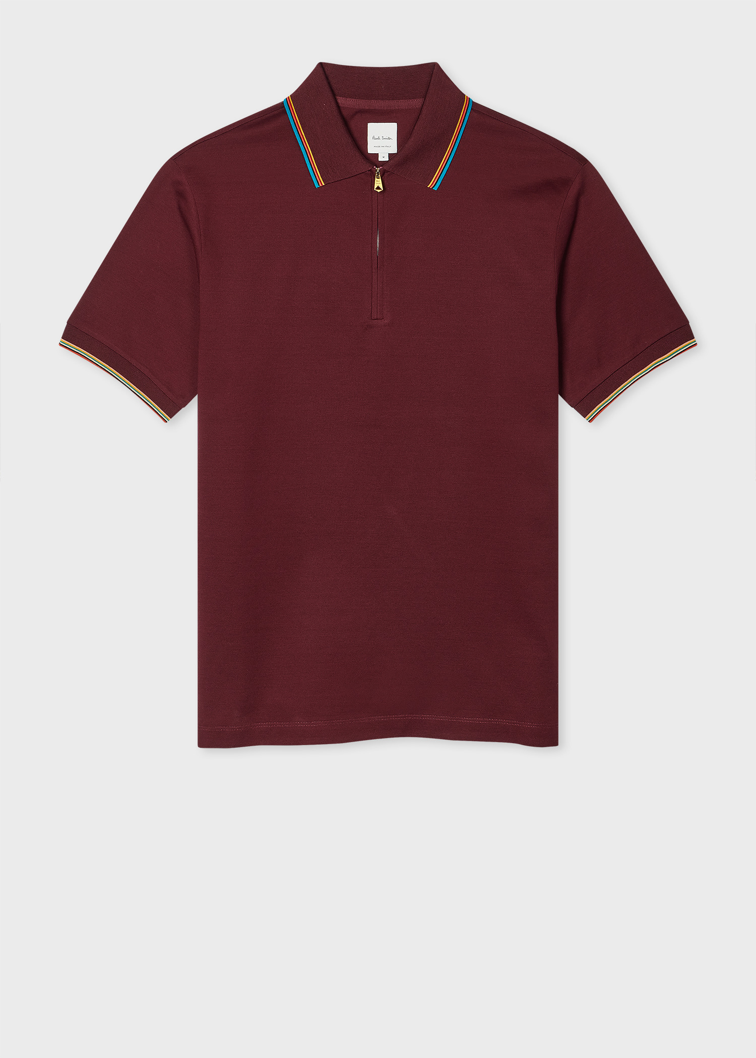 Made in Italy from 100% soft mercerised cotton-pique, this burgundy polo shirt features a contrasting 'Signature Stripe' collar and sleeves, complete with a zip neck fastening. An updated look on a timeless silhouette, this polo shirt can elevate your smart causal look to take it from day-to-night with the addition of complimentary tailoring. The Size Model wears a size M Model measures: Height 6’0’’ / 183cm | Chest 38’’ / 96.5cm | Waist 32’’ / 81cm The Fit - Regular-Fit is relaxed through the body. Product Code: M1R-487Y-L00089-28B