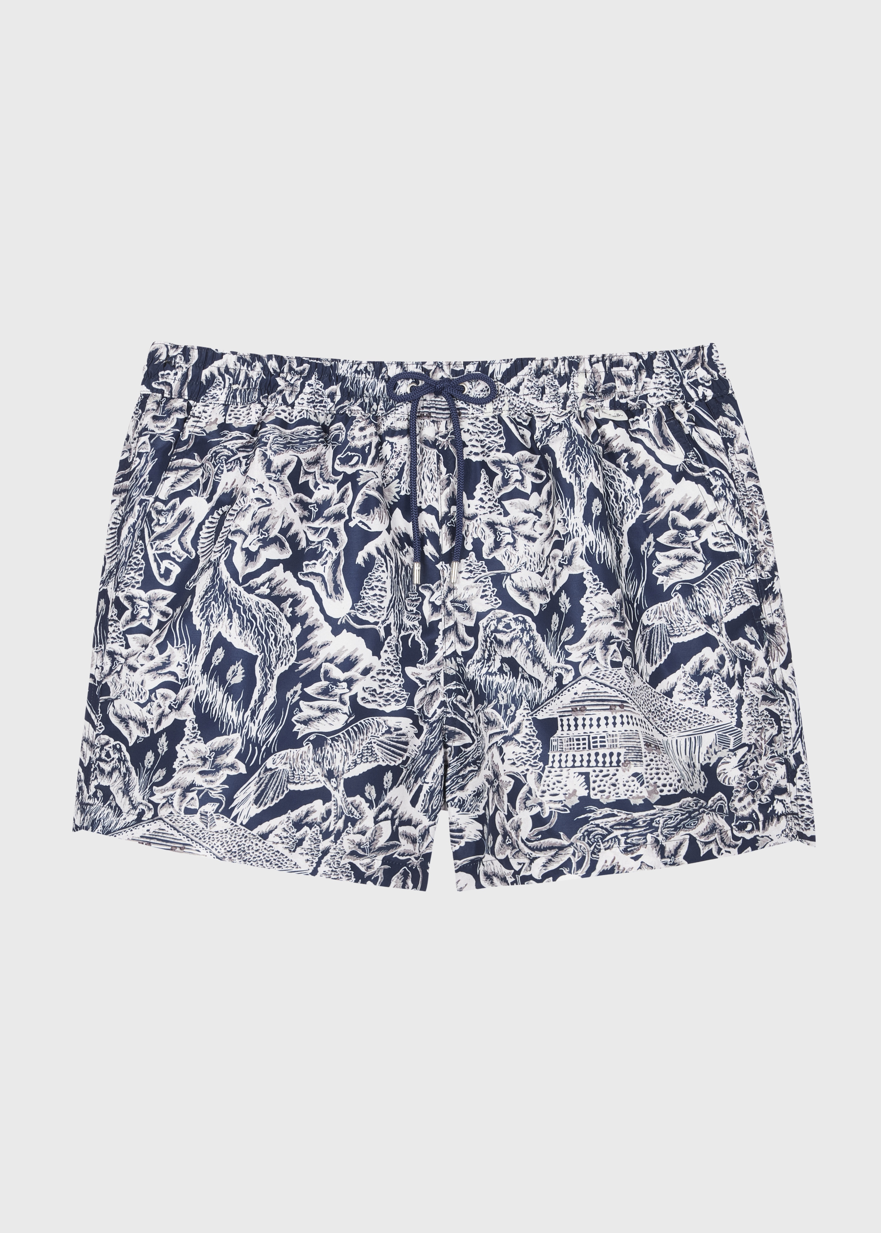 Constructed from lightweight fast-drying recycled-polyester with a soft finish, these navy blue net-lined swim shorts feature a 'Chalet' print throughout. The Fit Regular-fit Product Code: M1A-239B-T41627-49