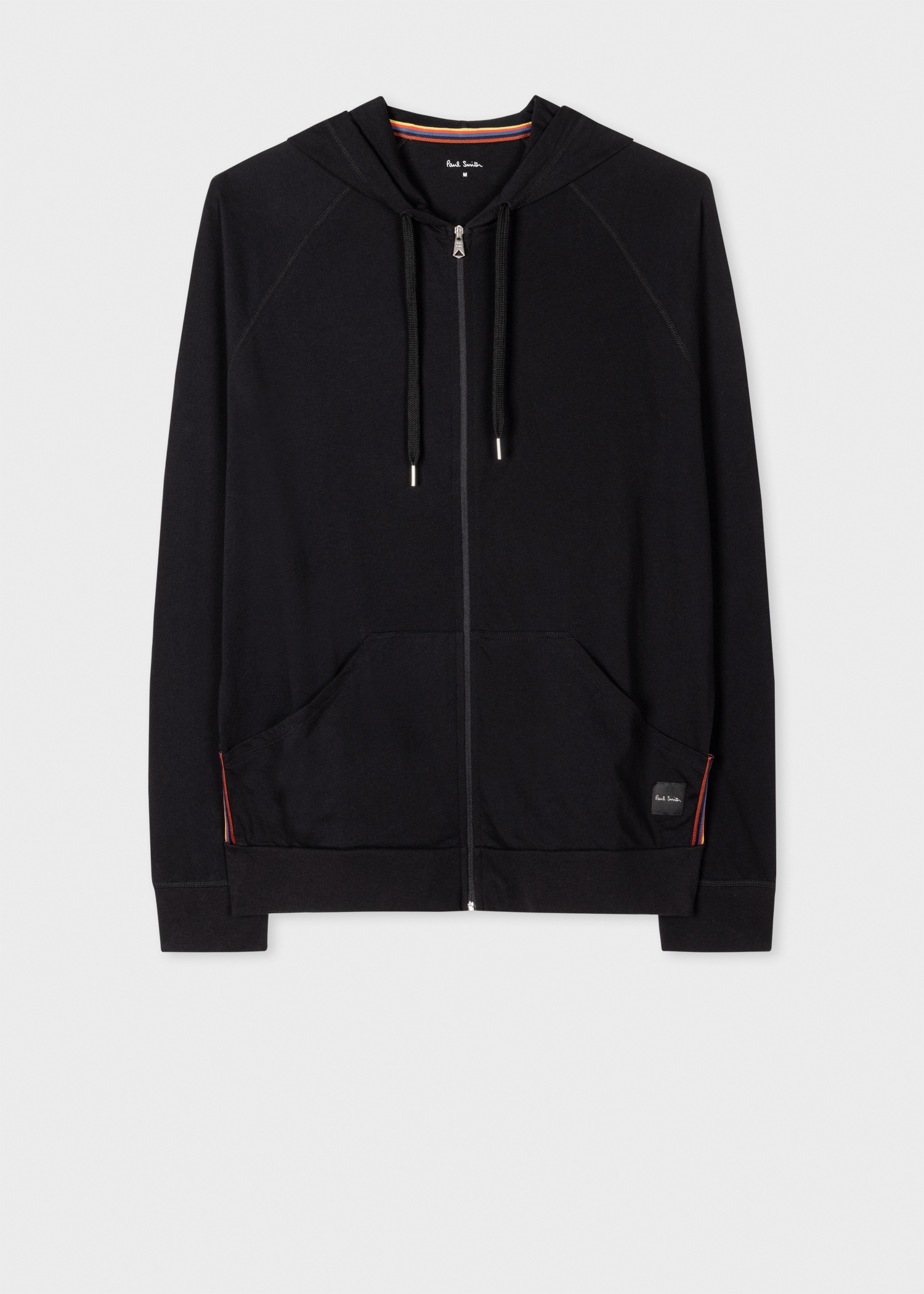 Cut from a lightweight cotton jersey, this black relaxed lounge hoodie features a zip-front with a tie-shape zip pull. Designed for a comfortable fit, this loungewear essential will seamlessly elevate your everyday wardrobe. Finished with raglan sleeves and front pouch pockets with 'Artist Stripe' trim. 100% Cotton Machine washable Product Code: M1A-500M-AU279B-79