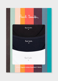 Three pack of white, navy and black crew neck T-shirts made from soft 100% organic cotton. Featuring a small Paul Smith logo print on the chest and inside the collar. Designed for a comfortable fit, this loungewear essential will seamlessly elevate your everyday wardrobe. 100% Cotton Machine washable Product Code: M1A-389-M3PK-2A