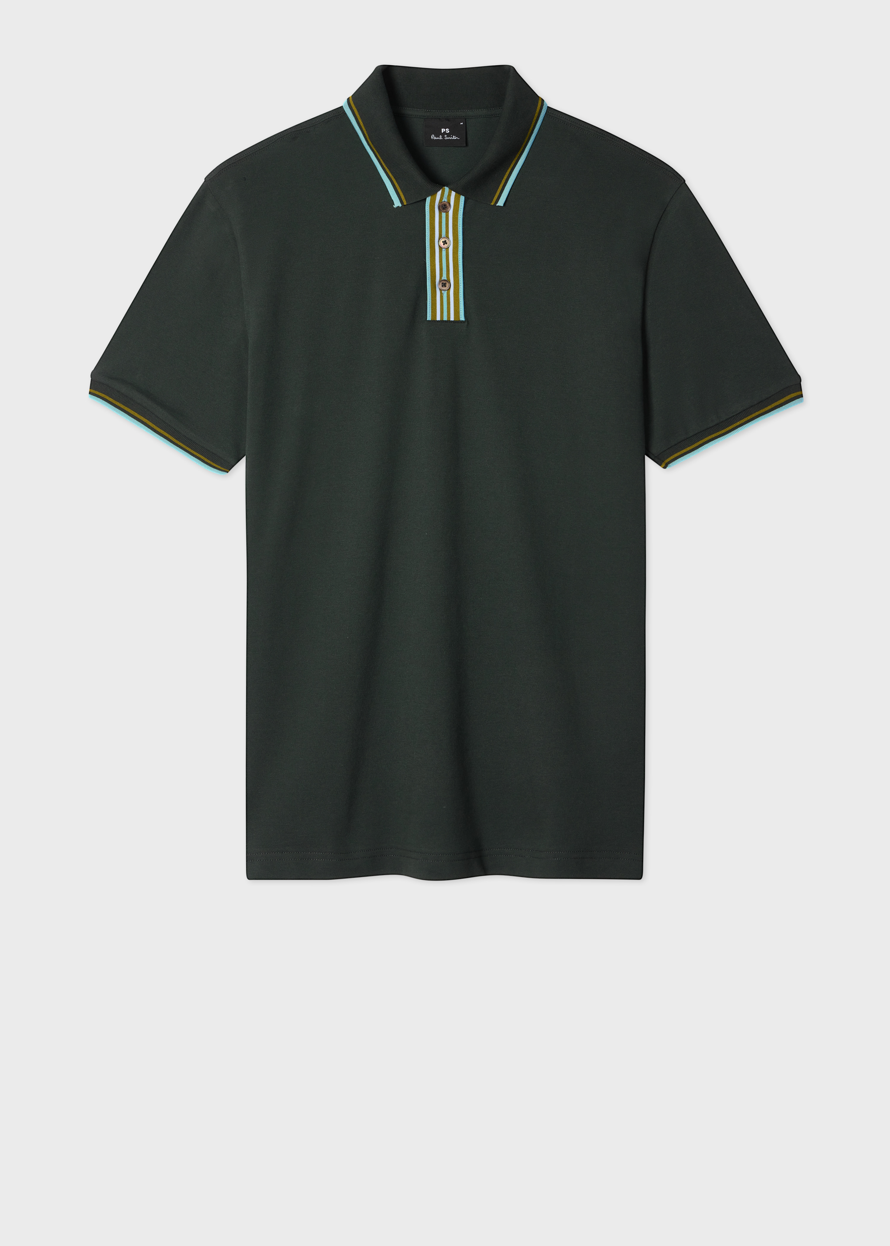 Made from an organically grown cotton with stretch for comfort, this dark green polo features contrast stripe tipping on the placket, collar and cuffs. The Fit - Regular-Fit Product Code: M2R-096Z-T21511-38D