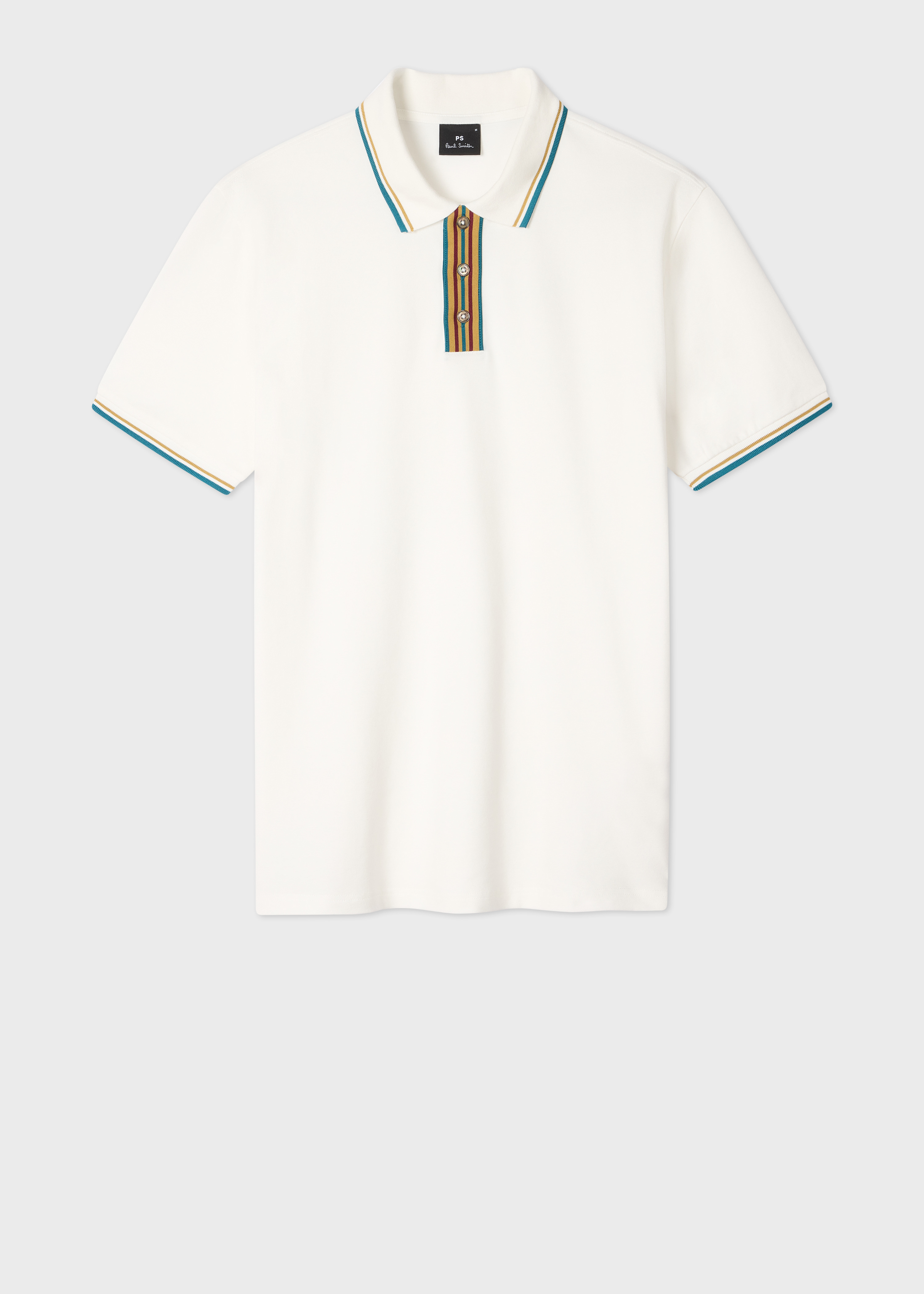 Made from an organically grown cotton with stretch for comfort, this ecru polo features contrast stripe tipping on the placket, collar and cuffs. The Fit - Regular-Fit Product Code: M2R-096Z-T21511-02A
