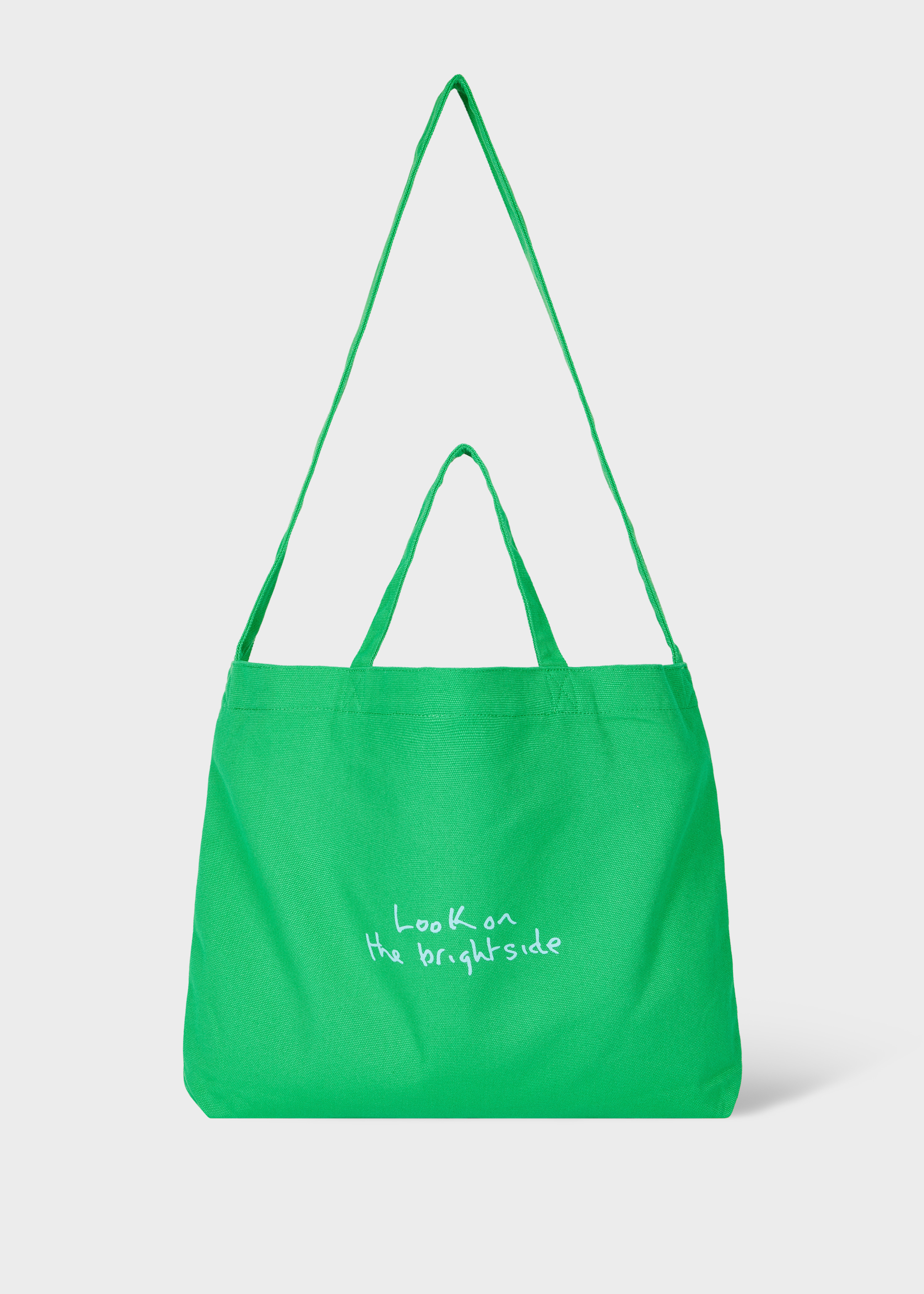 Made from 100% cotton canvas for durability, this green tote bag features an embroidered signature logo and a 'Look on the brightside' quote from Paul, printed on the other side. Made as part of Floral St Summer Shop collection, this bag is ideal for carrying your daily essentials. Product Code: M1A-8284X-RQUOTD-31