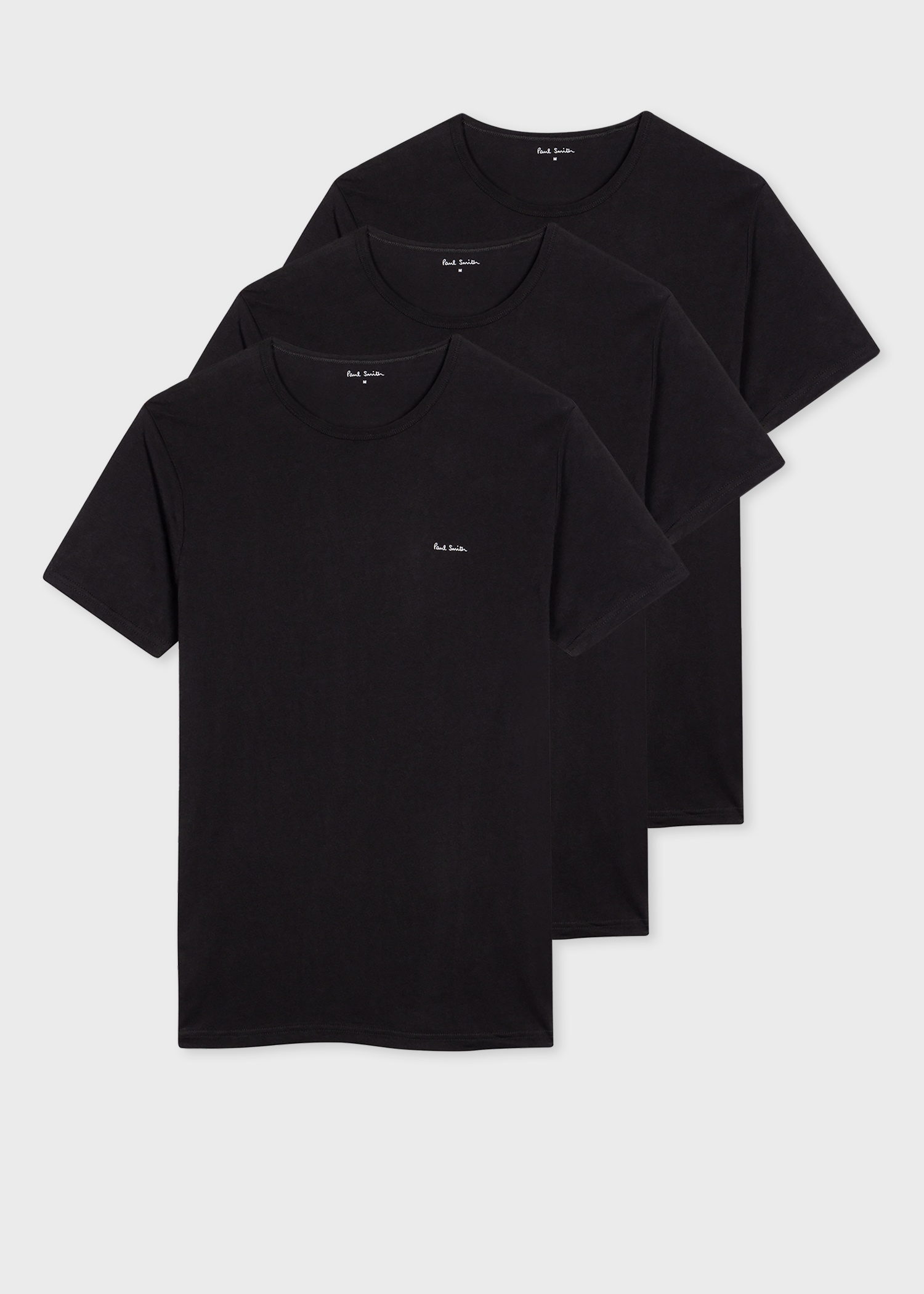 This three-pack of black crew neck T-shirts is made from soft 100% organic cotton, and features a small Paul Smith logo print on the chest and inside the collar. Designed for a comfortable fit, this loungewear essential will seamlessly elevate your everyday wardrobe. 100% Organic Cotton Machine Washable Product Code: M1A-389-M3PK-79