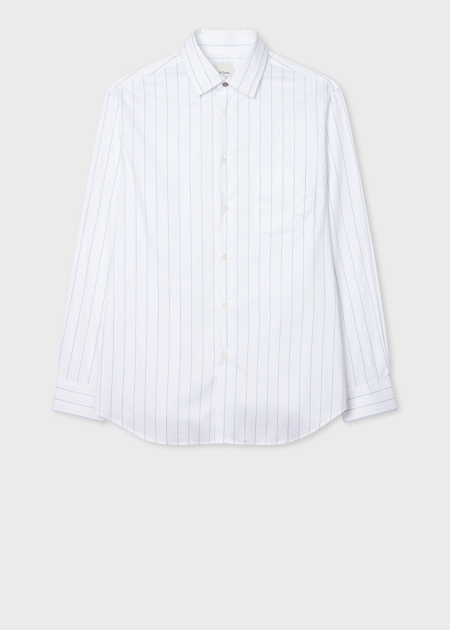 Crafted in Italy from soft 100% cotton with a subtle double fine stripe, this white long-sleeve shirt is cut for a more relaxed modern-fit. Complete with chest patch pocket and point collar with removable bones, this shirt is finished with contrasting purple buttons at the collar and cuffs. The Fit - Modern-Fit Product Code: M1R-889Z-R02874-02