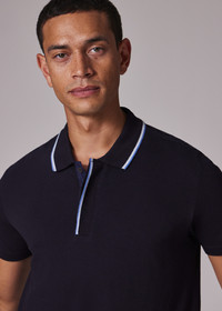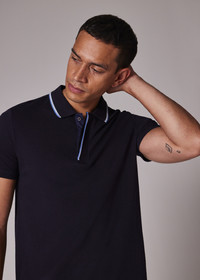 Crafted from 100% cotton, this navy polo shirt features distinctive contrast tipping for a refined casual look. Cut for a regular fit, this versatile piece is finished with classic details. Pair with jeans or chinos for an effortless smart-casual style. The Fit - Regular-Fit is relaxed through the body. Product Code: M2R-219Z-T22117-49