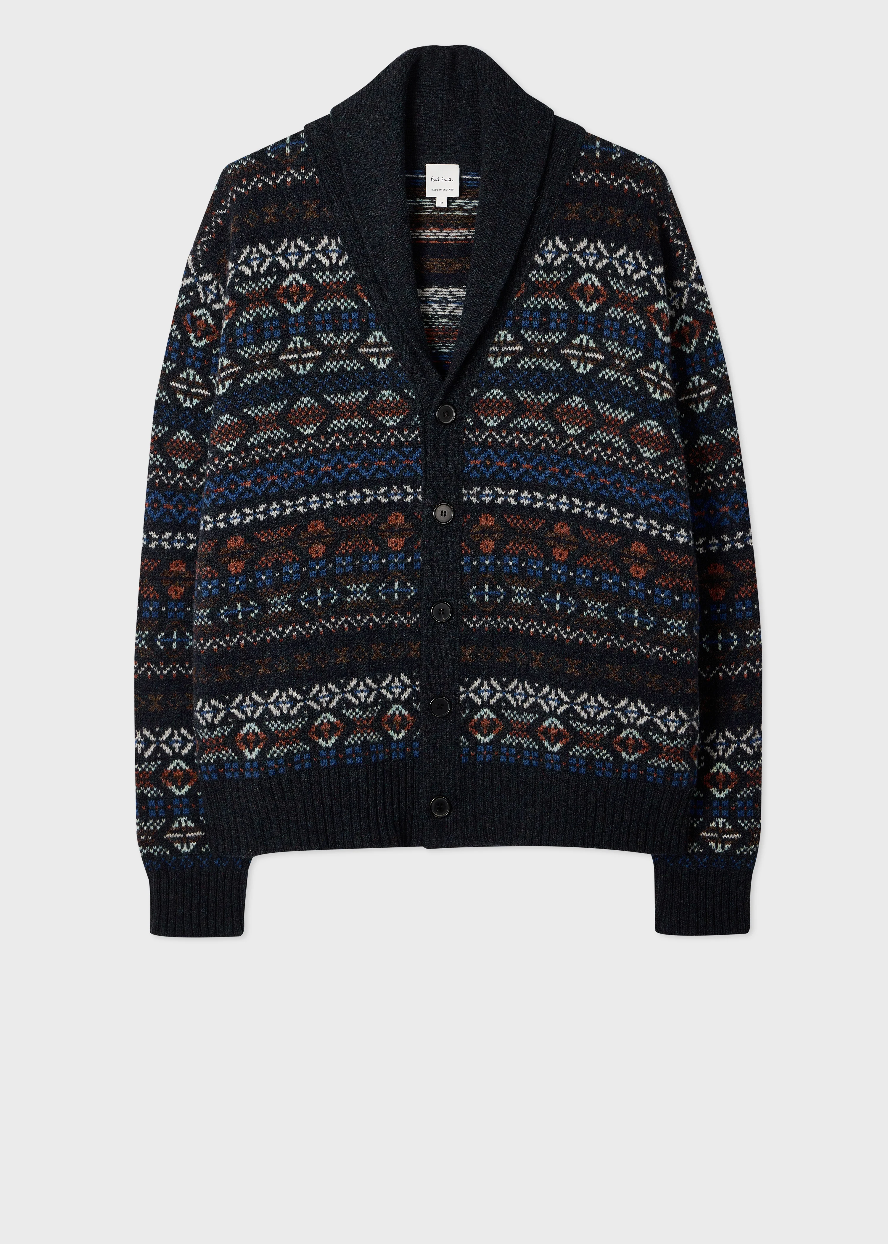 Crafted in England from 100% Shetland wool for a warm finish, this navy cardigan features a timeless Fair Isle pattern throughout. Complete with an elegant shawl collar design, this cardigan is finished with a five button placket and ribbed cuffs and waistband. The Fit - Regular-Fit Product Code: M1R-755Z-R02916-49