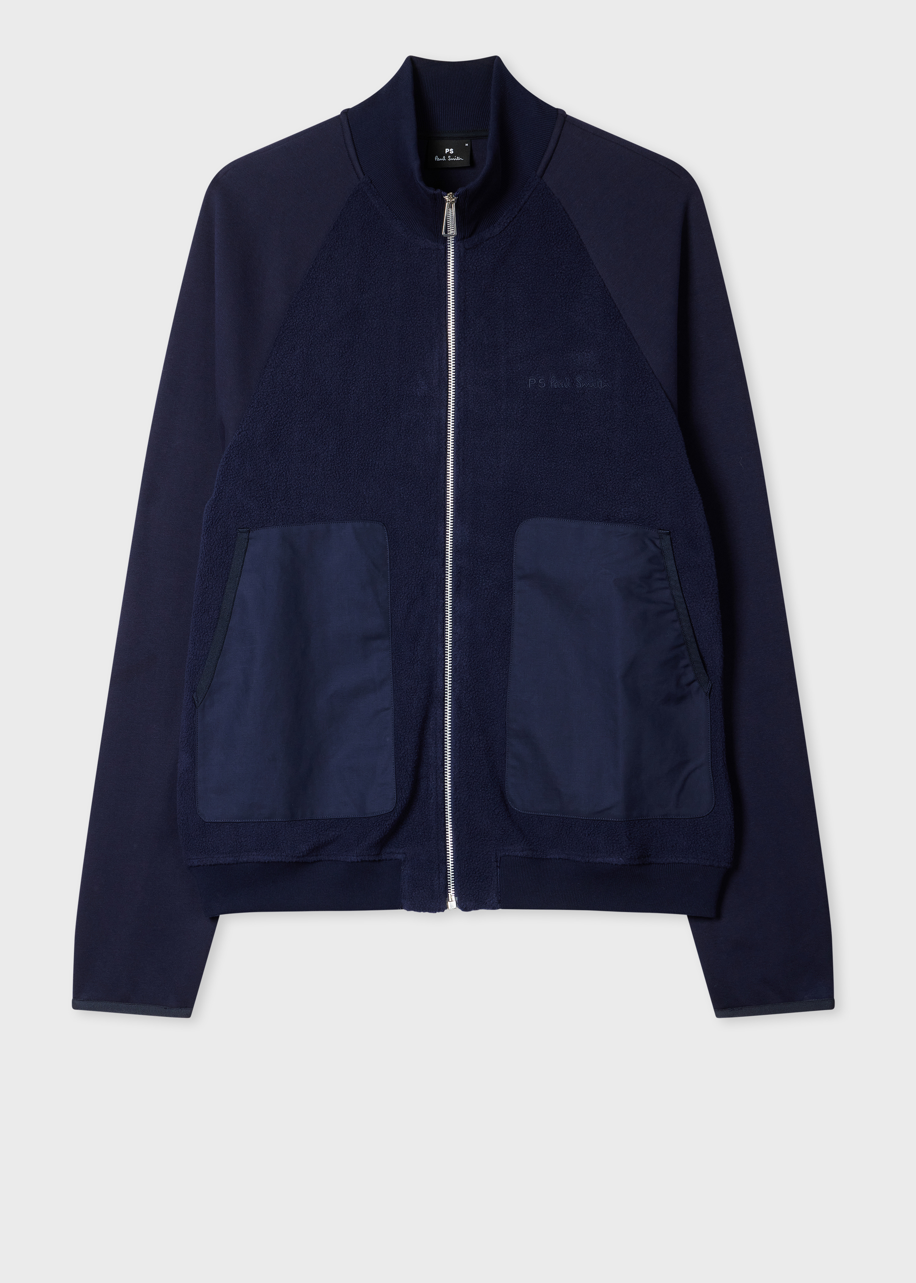 Made from a mix of polyester and cotton-jersey, this navy zip sweatshirt features front and back fleece panels with tonal jersey sleeves and pockets. An ideal transitional item, this sweatshirt is finished with a full zip closure and ribbed funnel neck. The Fit - Regular-Fit is relaxed through the body. Product Code: M2R-216Z-T22473-49