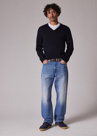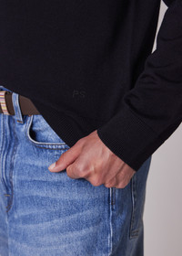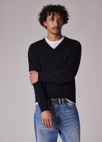 Made from 100% Merino wool for a soft, lightweight and breathable finish, this navy sweater features a classic V-neck shape. Complete with two-colour stripe tipping for an added twist, this sweater is finished with tonal initials embroidered at the hem. 100% Merino Wool Hand wash The Fit Regular-Fit Product Code: M2R-320Z-R22307-49