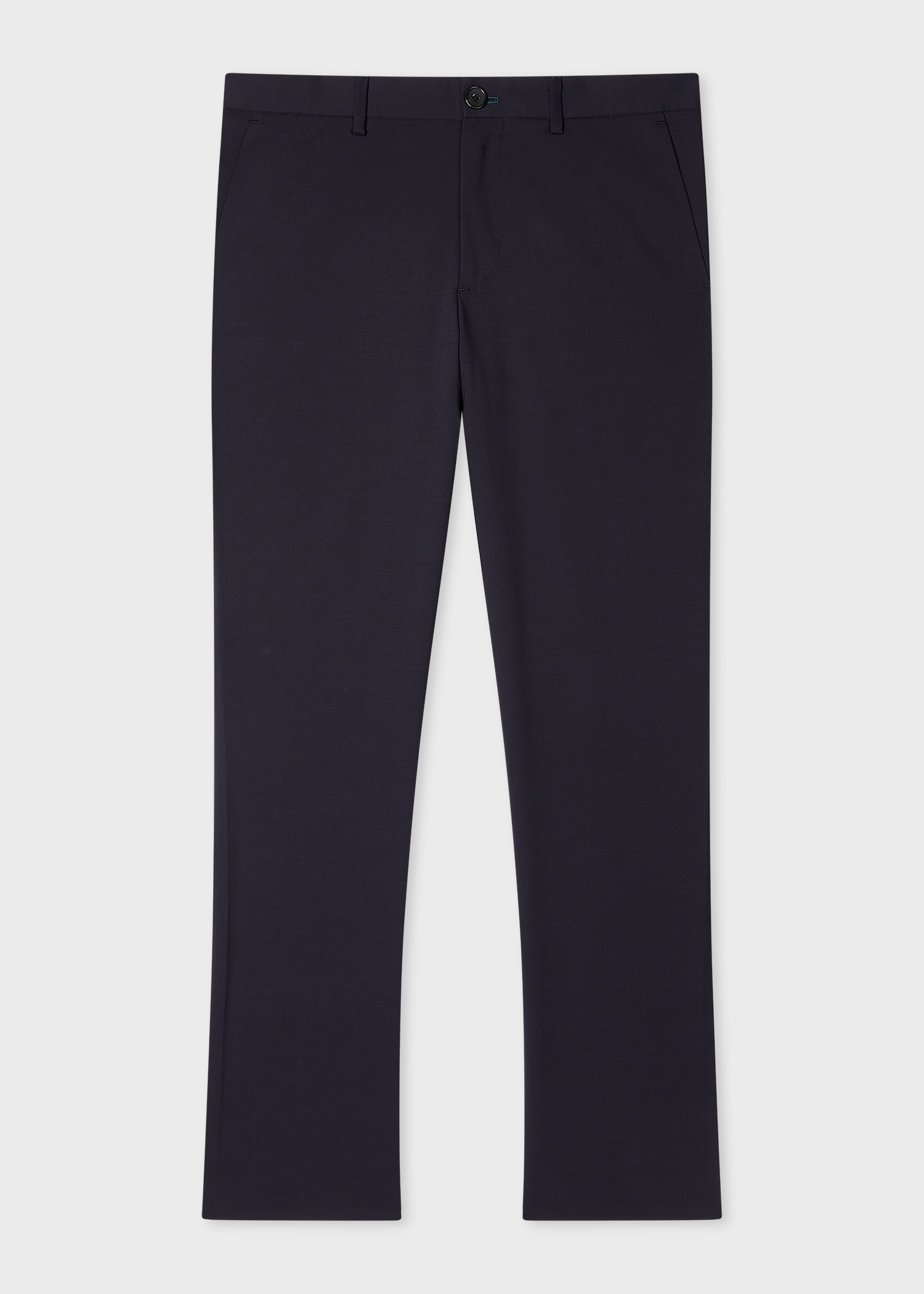 Made from a wool and cotton blend cloth with elastane stretch for comfort, these mid-fit navy trousers feature a classic chino design. Pair with a crisp white shirt to elevate smart casual styling this season. Product Code: M2R-922P-T22423-49