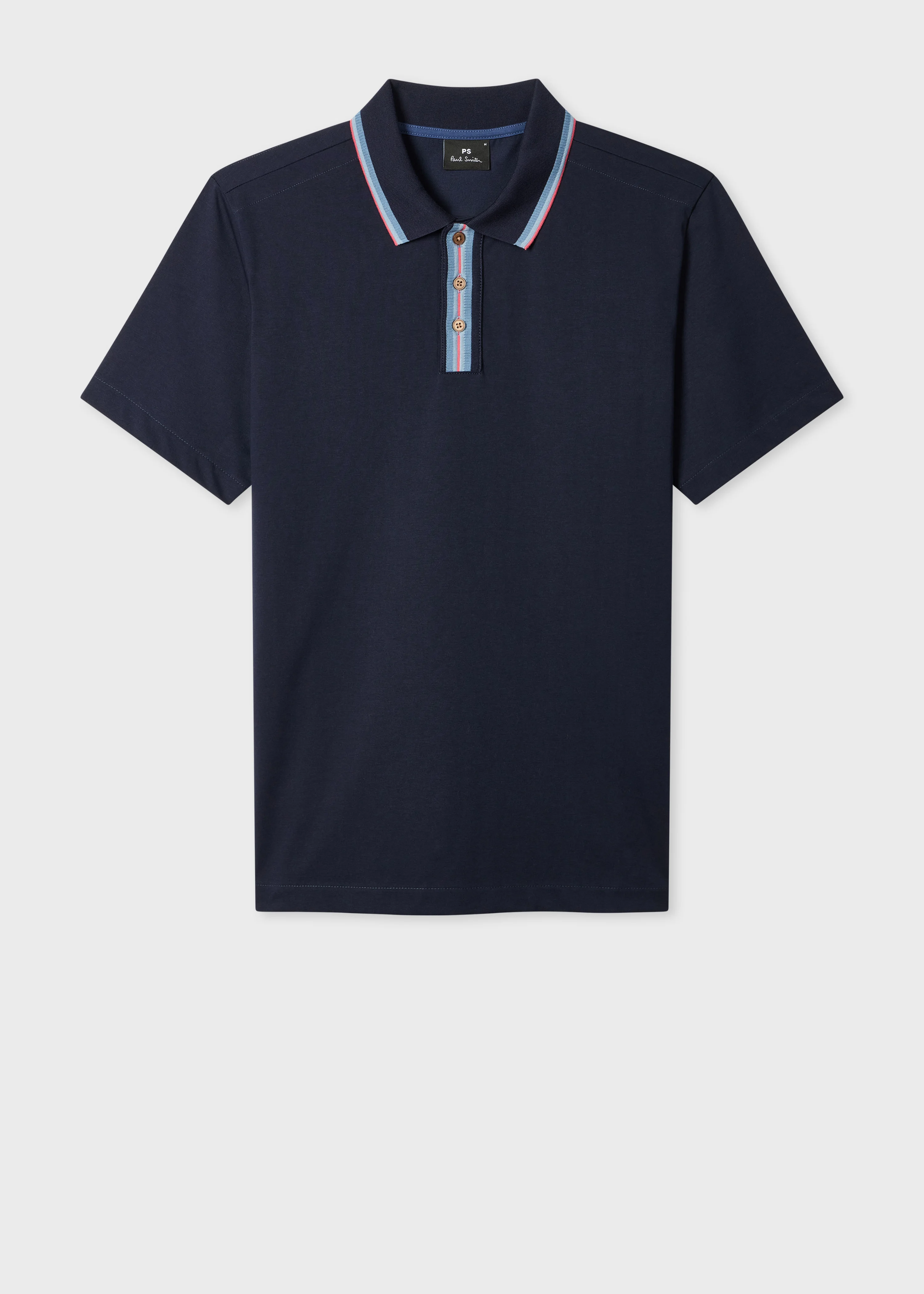 Made from a cotton and polyester-blend plated jersey, this navy polo shirt features a three button placket with contrast three-colour stripe tipping. Cut for a regular-fit, this polo is finished with tonal stitch detailing down the sides, shoulder, cuffs and hem. The Fit - Regular-Fit Product Code: M2R-730Z-V22183-49A