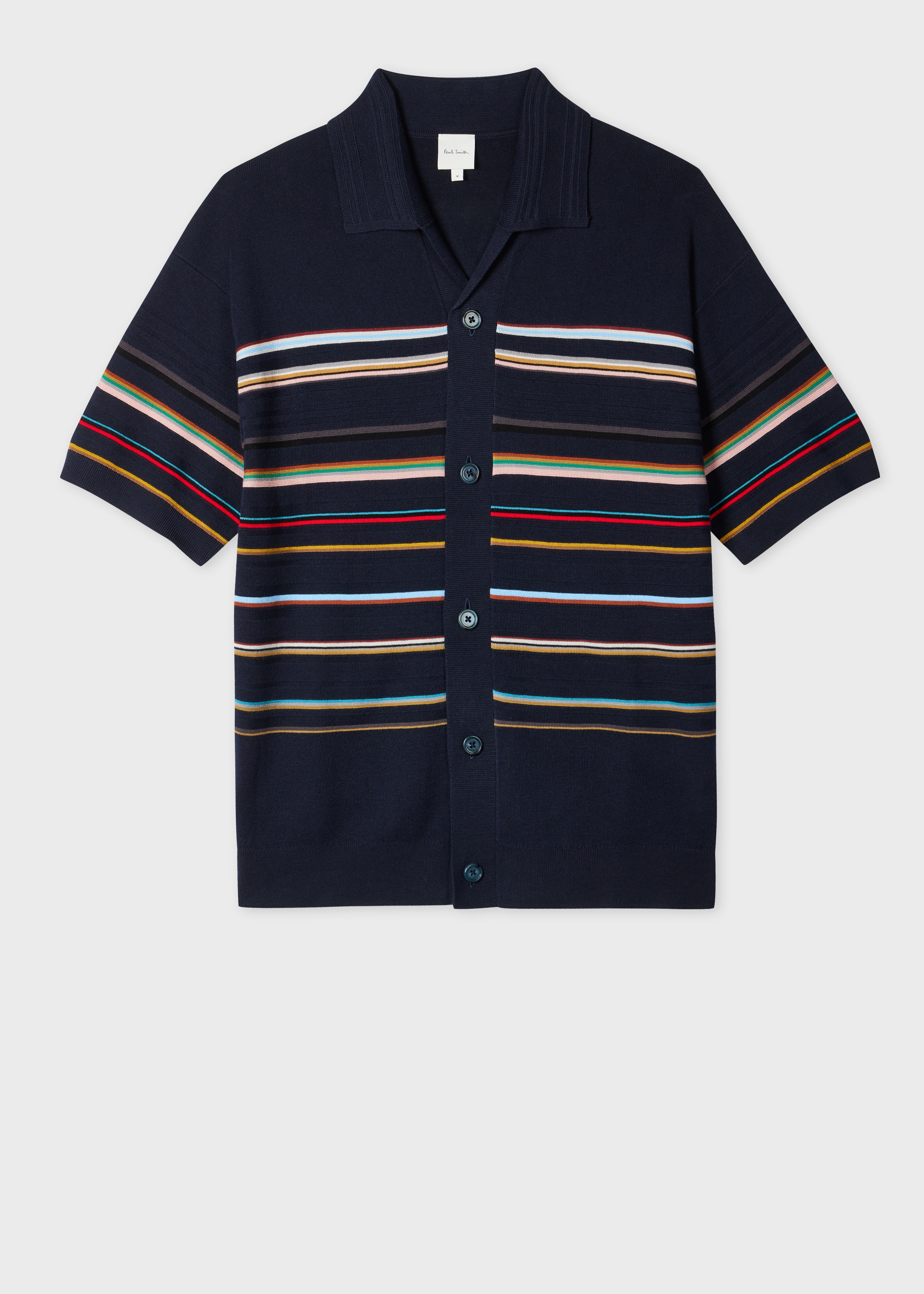 Made from premium all needle organic cotton, this navy knitted shirt features a classic casual short-sleeve design. Complete with our 'Signature Stripe' textured garter stitch detail for a tactile finish, this shirt is finished with a relaxed collar and ribbed waistband. The Fit - Regular-Fit Product Code: M1R-532Z-T02765-49