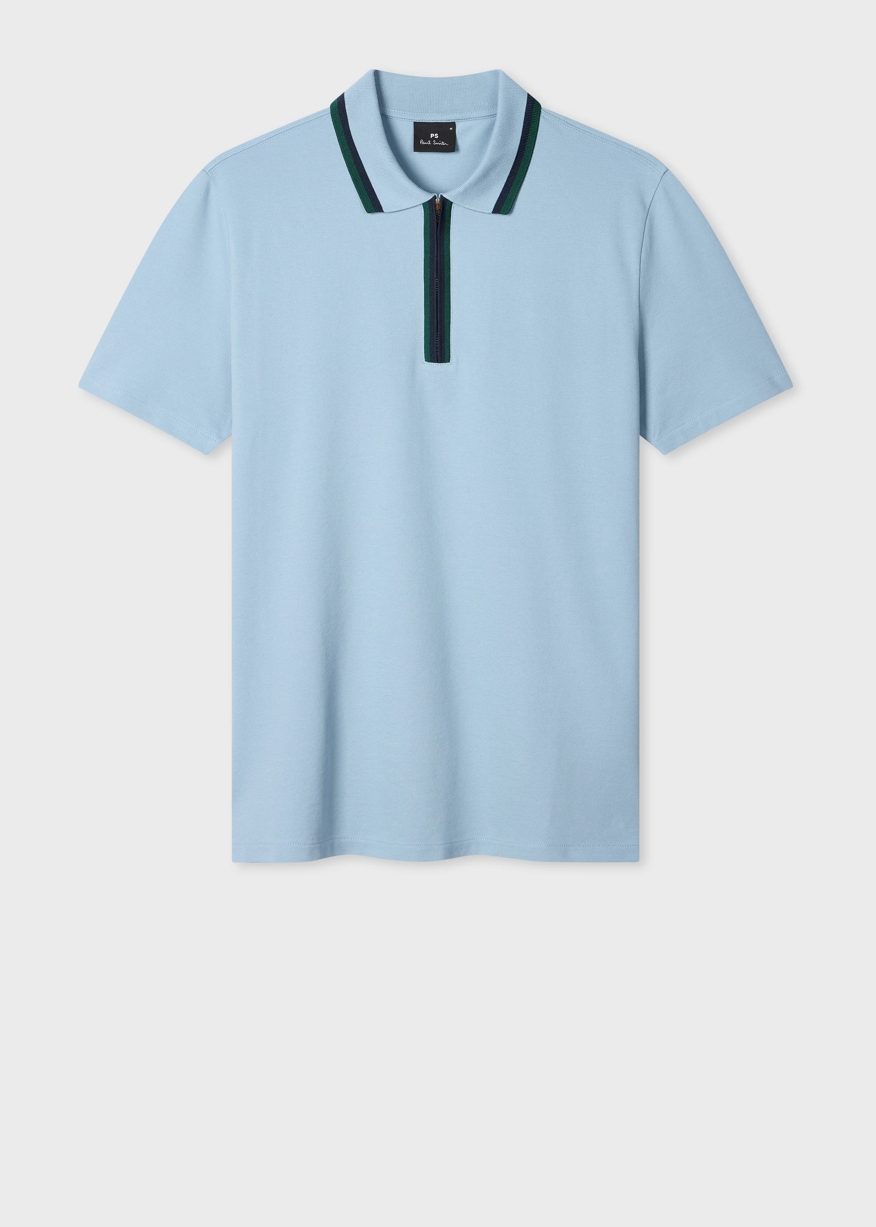 Pale Blue Contrast Tipping Zip Polo Shirt