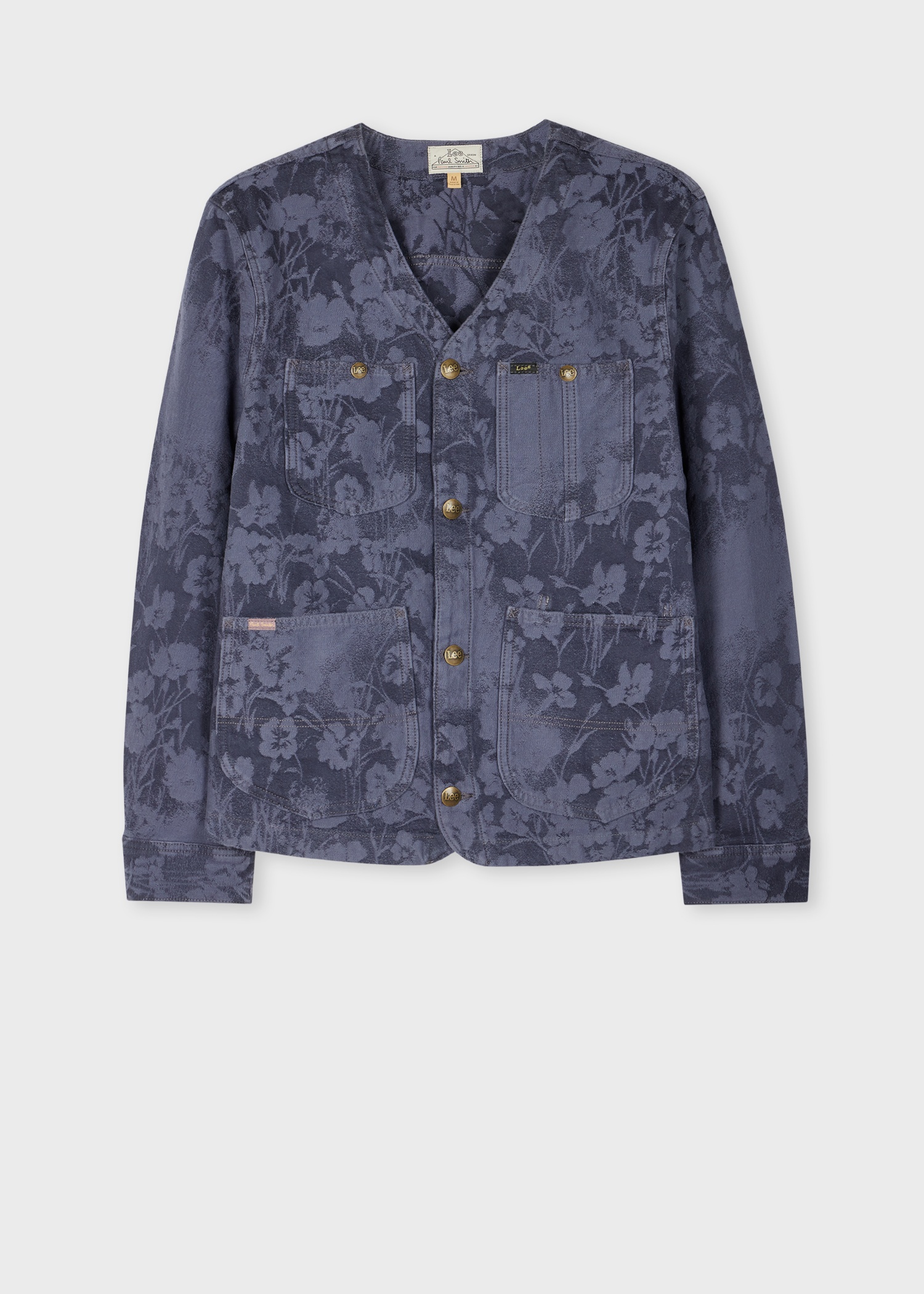 Crafted from 100% cotton, this gem from the Paul Smith + Lee® collection sets your classic chore coat abloom. A collarless take on one of our iconic pieces, this jacket invokes the most beloved elements of the piece from the contrast interior pocket to the straight-stitched collar and waist-cinch at the back. Outfitted with brass logo buttons to complement the unique poppy design, it’s a statement in both style and durability. [b]Paul Smith + Lee®[/b] We enlisted six friends of Paul Smith – two musicians, a photographer, a dancer, a painter, and a lawyer – to demonstrate the collaboration’s easy-going appeal. [b][url="discover/collaborations/lee"]Discover More[/url][/b] 100% Cotton Machine washable [b]Please note for legal reasons this product cannot be shipped to India. Any orders processed will be cancelled and refunded.[/b] The Size Model wears a size M Model measures: Height 6’1’’ / 186cm | Chest 37 ½ ’’ / 95cm | Waist 30’’ / 76.5cm Product Code: M1R-CLESS-PJACFL-46