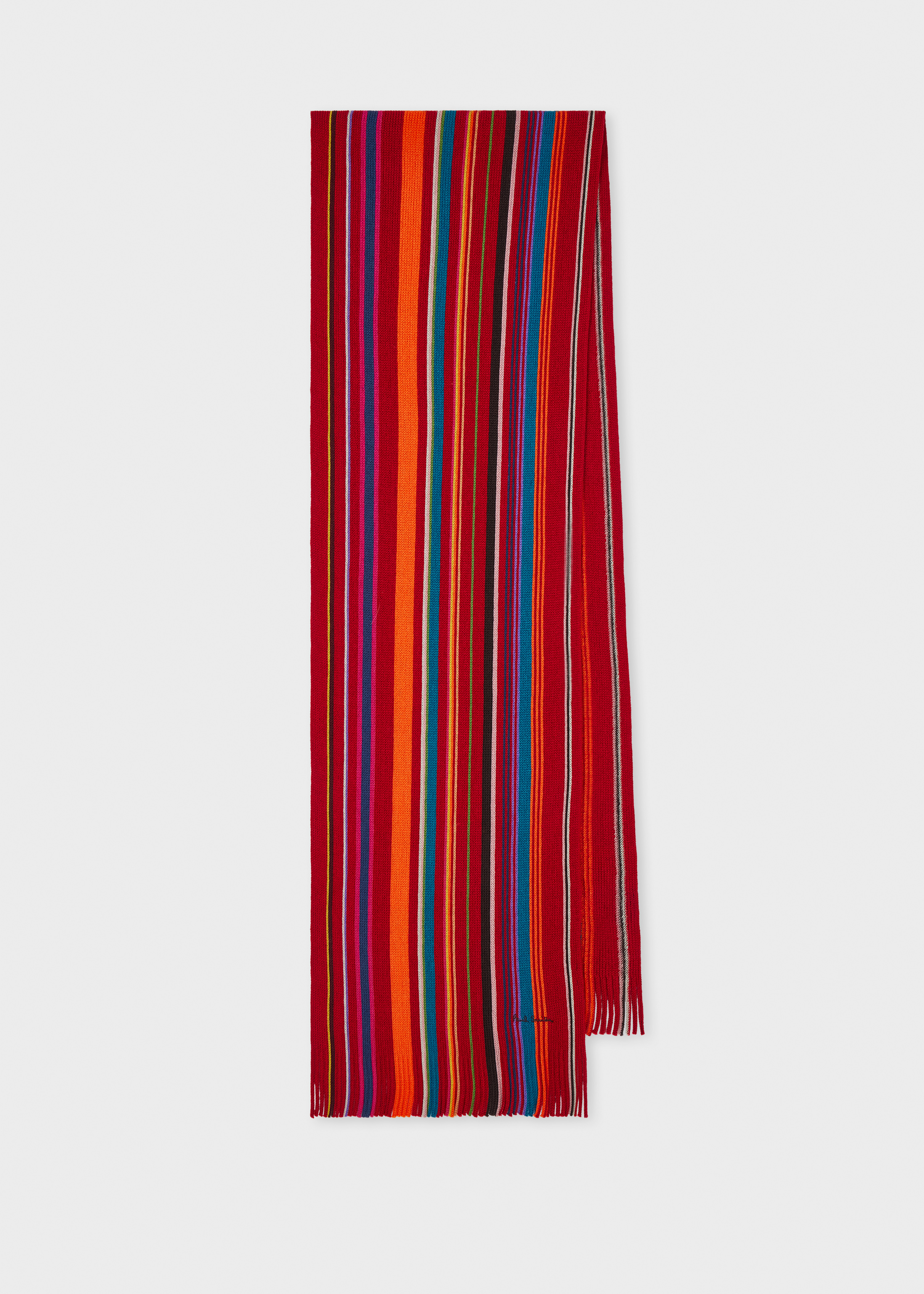 Made from 100% soft merino wool, this scarf features a red stripe pattern throughout. Perfect for the transitional weather, this scarf is complete with frayed edges and a signature embroidered logo. Product Code: M1A-151F-T644-28