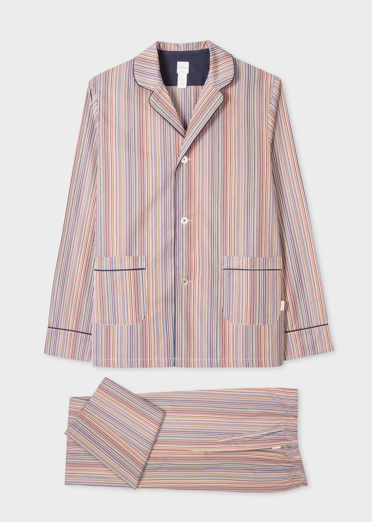 Crafted from luxurious 100% Italian cotton, this pyjama set features our classic 'Signature Stripe' pattern throughout. The bottoms feature a button up fly fastening and a cream drawstring adjustable waistband. The three-button fastening top features two patch pockets and navy blue piping. 100% Italian Cotton Machine washable The Size Model wears a size M Model measures: Height 6.2 ” / 187.5cm | Waist 28”/ 71.5cm | Chest 35 “/ 88.5cm The Fit Regular-Fit is relaxed through the body. Product Code: M1A-2871N-ASMULT-92