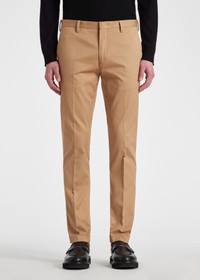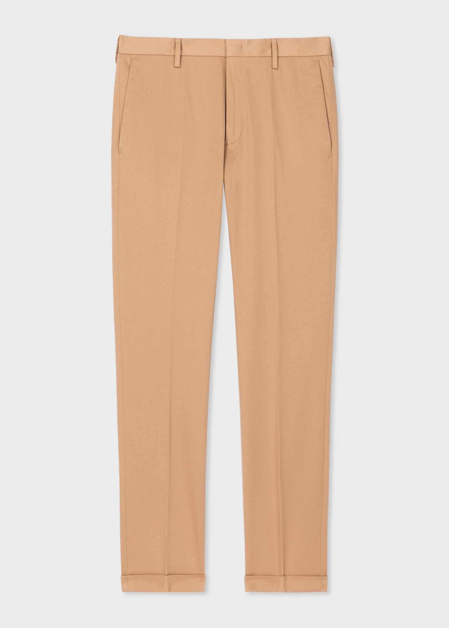 Made in Portugal from cotton twill cloth with stretch for added comfort, these tan chinos feature classic styling with turn ups at the hem. 98% Cotton, 2% Elastane Machine washable Made in Portugal The Size Model wears a size 32 Model measures: Height 6 ” / 185cm | Waist 29”/ 73cm | Chest 36 “/ 92cm The Fit Slim-Fit is cut for a close fit through the leg. Product Code: M1R-255U-M02138-60