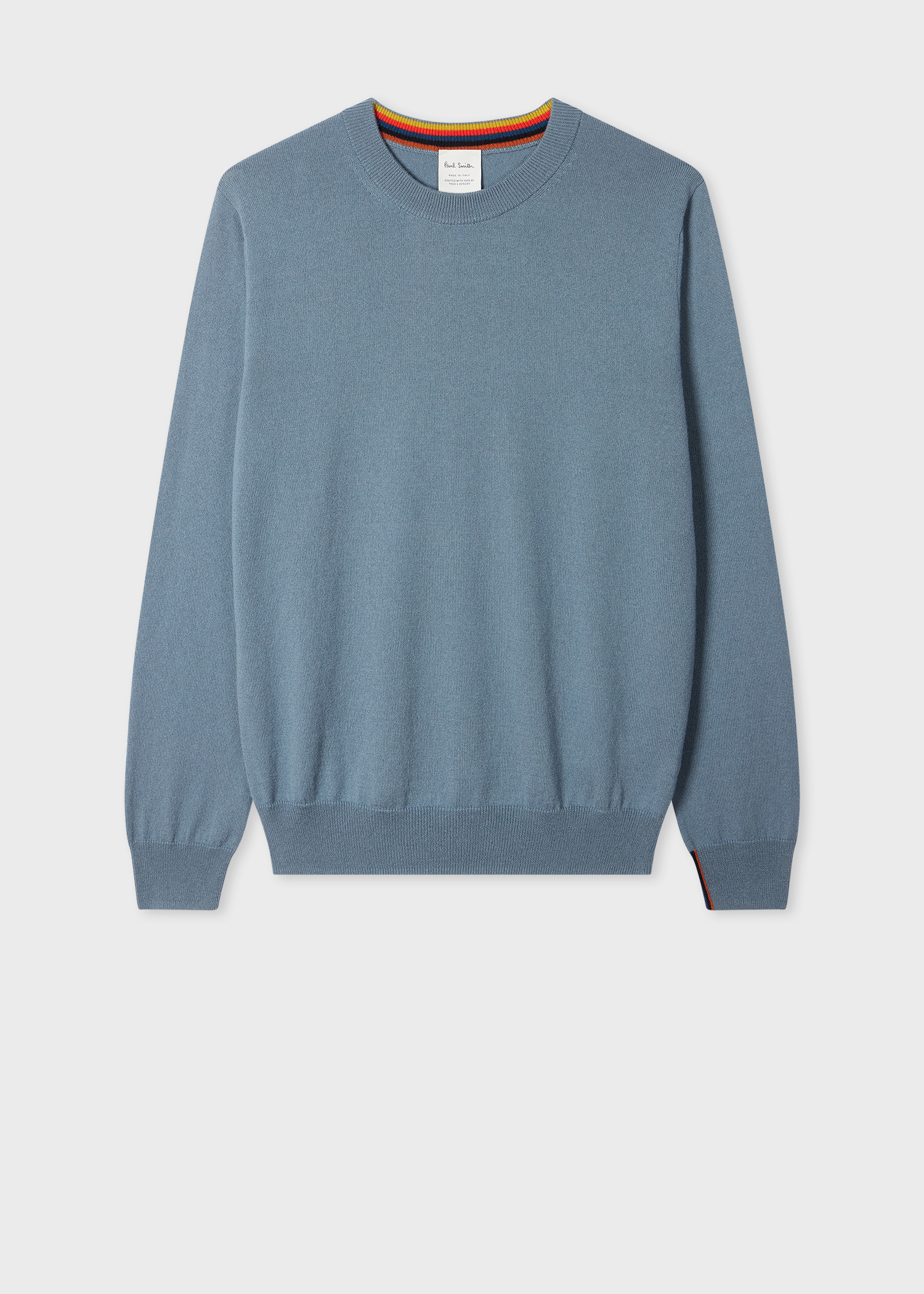 Made in Italy, using premium cashmere that is spun in the UK by Todd & Duncan at their Loch Leven Mill in Scotland - this stone blue crew neck sweater features 'Artist Stripe' internal collar and cuff trim - for an added flash of colour. Cut for a regular-fit, this sweater is finished with ribbed cuffs, collar and waistband. The Fit - Regular-Fit is relaxed through the body. Product Code: M1R-278Y-N02497-43