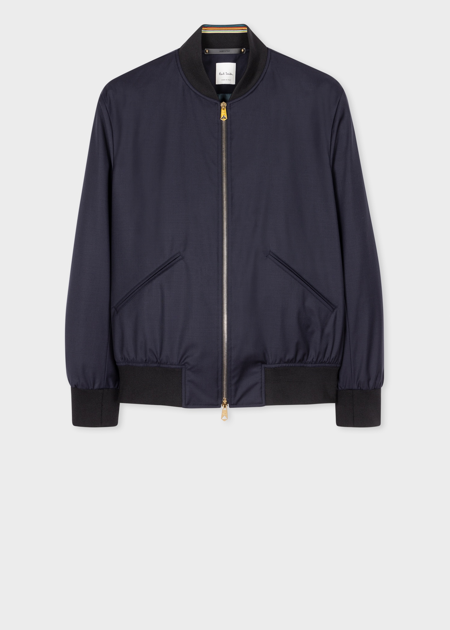 Made using a technical wool cloth from Loro Piana and treated with Green Storm System® for a waterproof and wind-resistant finish. Updated for 2023, this timeless, wardrobe staple, Paul Smith bomber jacket now features the iconic 'Signature Stripe' throughout the internal fabrics. Both on the cupro lining inside the arms and trimmed along the edge of the ribbed collar, cuffs and waistband. 100% Wool outer | 100% Viscose cupro lining Dry clean only Made in Italy Loro Piana's latest pioneering achievement is Green Storm System®, an eco-friendly treatment that gives protection from rain and wind to any natural fabric. Green Storm System® uses a bio-based membrane derived from 50% renewable plant sources, and is complemented by the exclusive PFC-free. Not only does Green Storm System® guarantee the utmost comfort and performance, it respects our natural world, ensuring a condition of absolute well-being for professional and amateur athletes, world travellers and business people alike, regardless of weather conditions, season, or physical activity. Product Code: M1R-275U-L00041-49