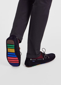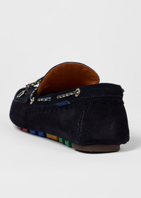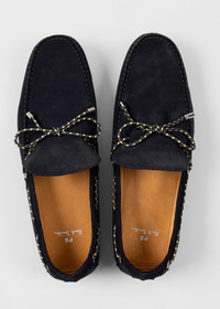 Made in Portugal from soft suede, these slip-on navy 'Springfield' loafers feature a rope tie detail on the front. Complete with our Paul Smith signature logo tab. Expertly finished with multi colour 'Sports Stripe' lugs on the outsole. 100% Leather Uppers 100% Rubber Soles Made in Portugal Product Code: M2S-SFD20-KSUE-49