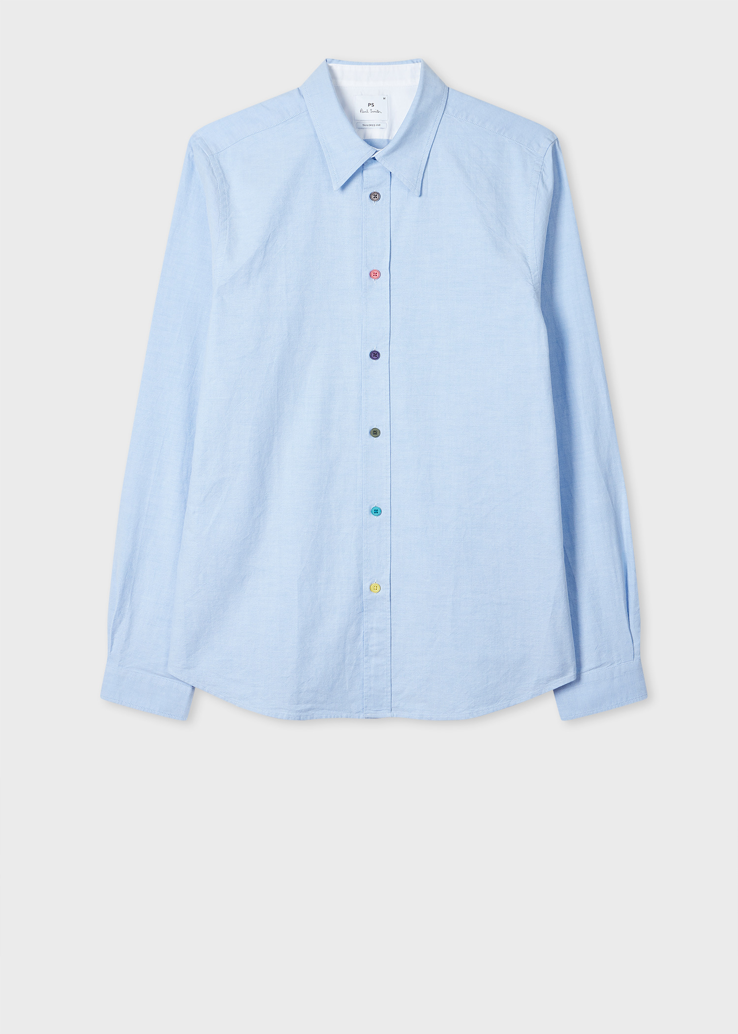 Made from organic cotton, this sky-blue Oxford shirt features multicoloured buttons throughout the front and cuffs - adding a pop of colour to this timeless style. Cut for a tailored-fit, this long-sleeve shirt is finished with a curved hemline and point collar. The Size - Model wears a size M - Height 6.1 ” / 185cm - Chest 38’ / 96 cm - Waist 31.5”/ 80cm The Fit - Tailored-Fit is cut for a slightly slimmer fit through the waist. Product Code: M2R-612P-T21846-40
