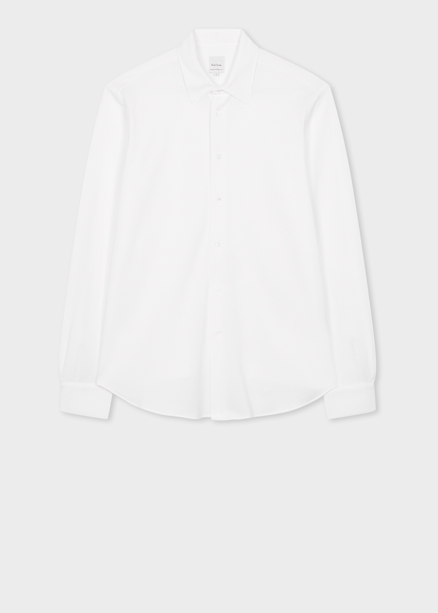 Made in Portugal from 100% cotton pique for a breathable finish, this white long-sleeve shirt features a classic plain design. Finished with a curved hemline, point collar, and tonal buttons throughout. 100% Cotton Machine washable Made in Portugal The Fit Regular-Fit is relaxed through the body. Product Code: M1R-080Z-N00086-01