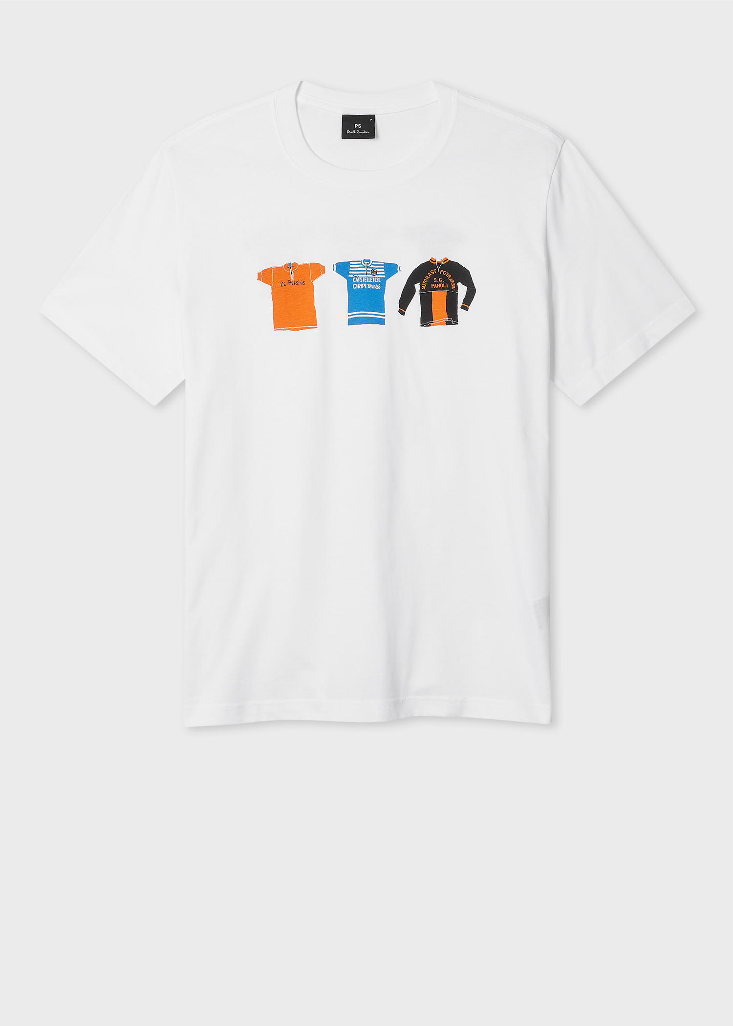Made from 100% organically grown cotton, this white crew neck T-shirt features a front and back 'Cycle Jerseys' print, taken from the archive. Cut for a regular-fit, and finished with a ribbed collar. The Fit - Regular-Fit is relaxed through the body. Product Code: M2R-011R-TP7222-01
