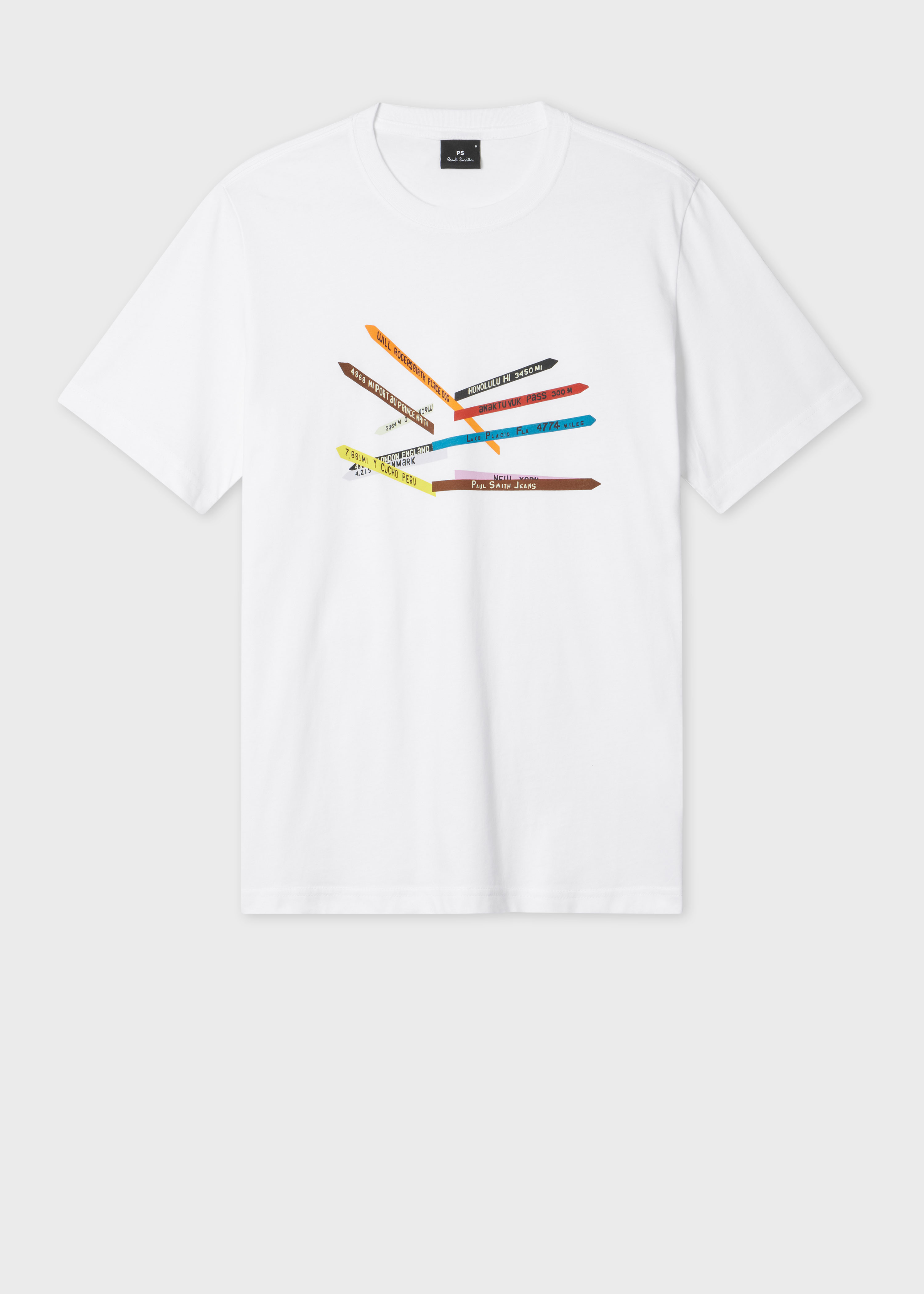 Made from organically grown cotton, this white crew neck T-shirt features a 'Sign Posts' print taken from the archives. Cut for a regular-fit, this T-shirt is finished with a ribbed collar. The Fit - Regular-Fit is relaxed through the body. Product Code: M2R-011R-TP7744-01