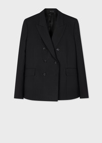 Made in Italy from a luxe wool crese-resistant composition this black blazer features a double-breasted fastening. Cut to a straight fit with subtle shaping to the back and an exaggerated peak label for a feminine feel. The blazer features a contrast lining and 'Signature Stripe' trims. 100% Wool Dry Clean Only Made in Italy The Fit Straight-Fit Product Code: W1R-369JA-N00001-79