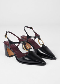 Made in Portugal from premium black leather, these heels feature a timeless court shoe silhouette, with gold cut-out detailing. Finished with gold hardware throughout, these heels are ideal for everyday styling, and can be taken from office to evening with the addition of complementary accessories. Product Code: W1S-AIA01-TLEA-79