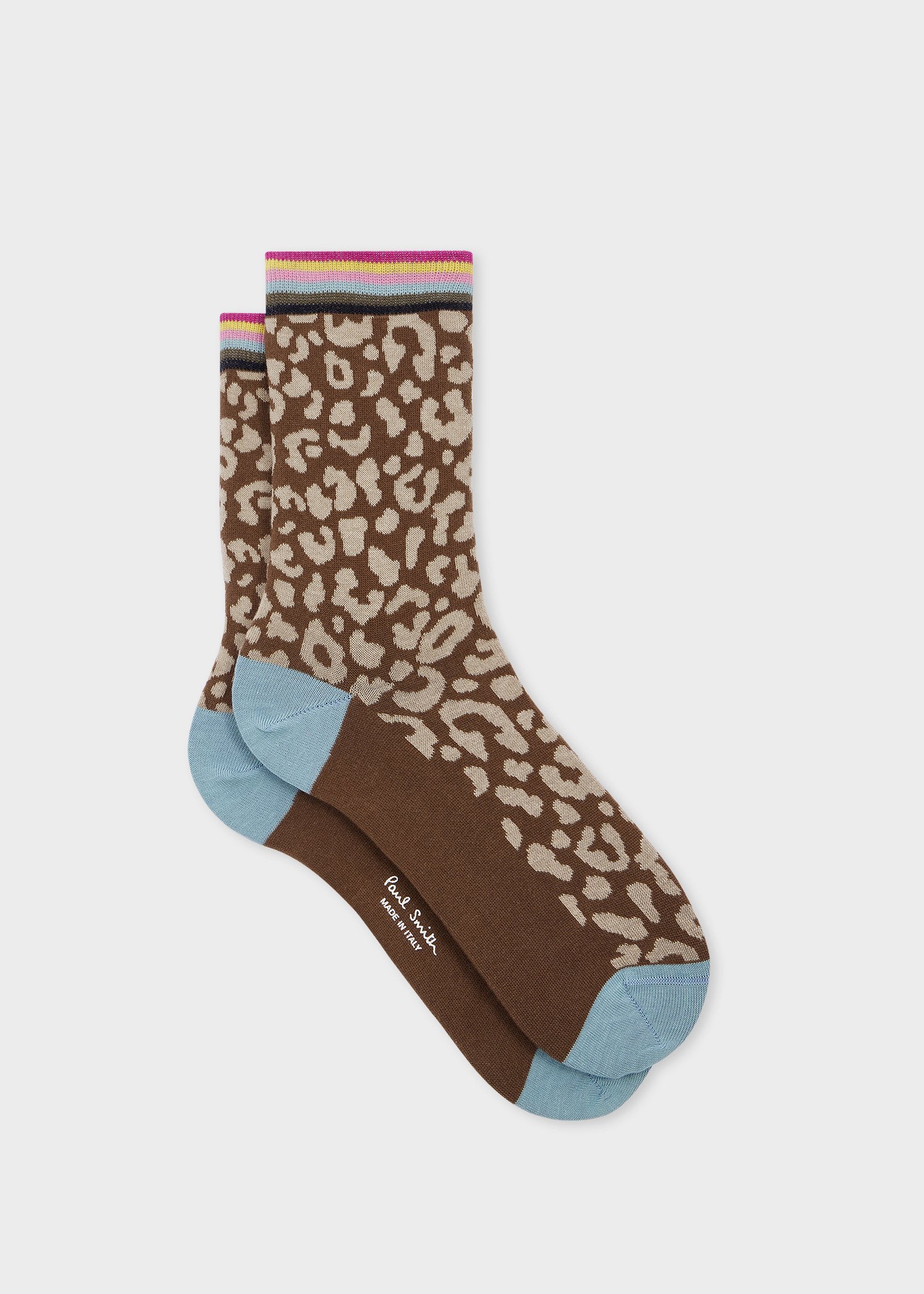 Made in Italy from an organically grown cotton blend, these unique socks feature a leopard print and tonal colour block design for a distinctive touch. They are complete with subtle branding. Product Code: W1A-086MO-T780-66