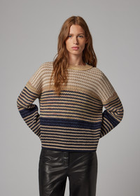 Crafted from a wool and silk blend, this crew neck sweater features a tonal brown and navy stripe design for added depth. This knit is cut to a relaxed fit and is the perfect layer to add to your wardrobe rotation, and is complemented with classic crew neck and ribbed trims to complete the look. The Fit - Relaxed-Fit is loose through the body. Product Code: W2R-795N-V31414-08