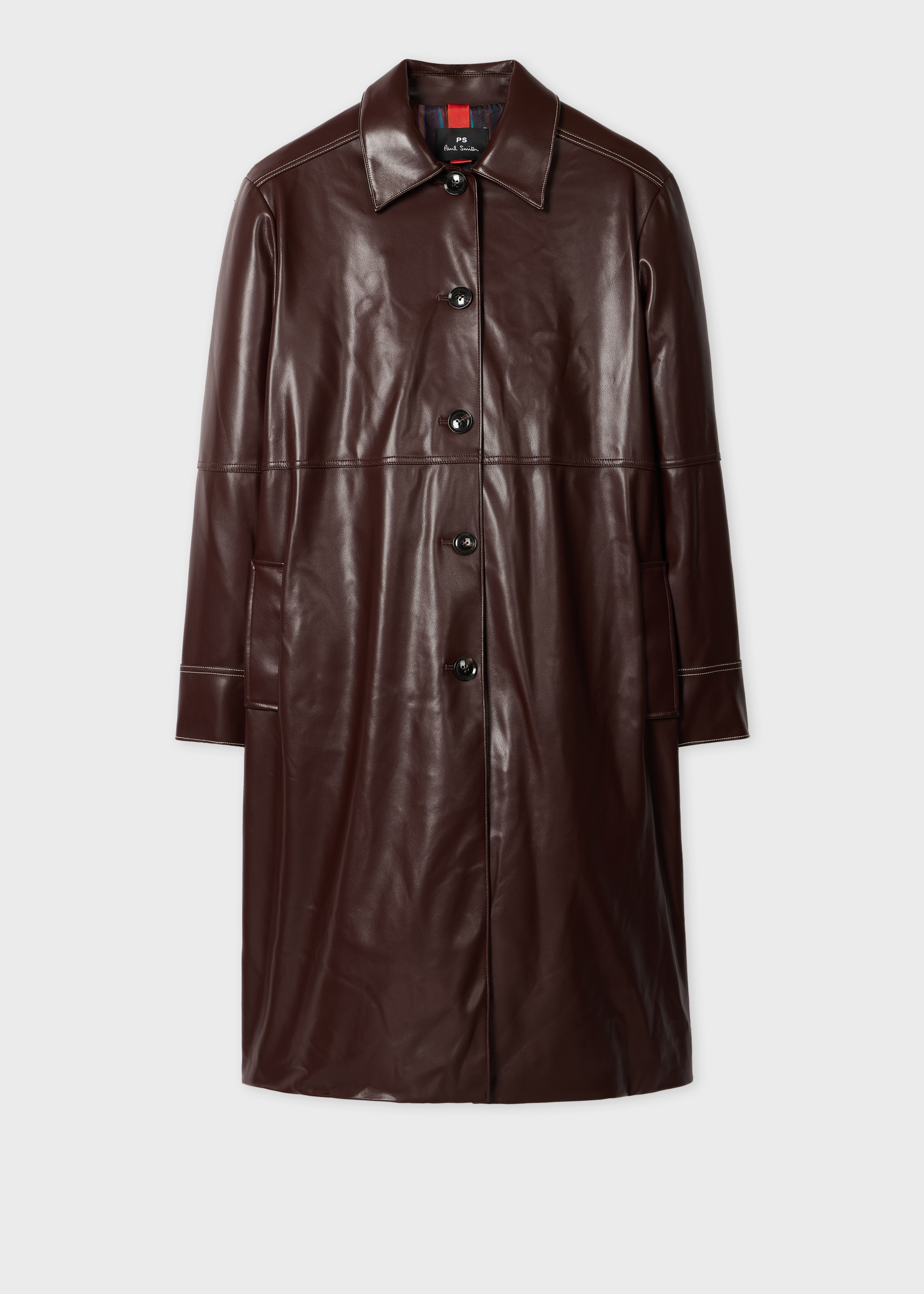 Elevate your attire this season with this modern trench coat made from a faux leather construction in a rich chocolate brown hue. Complete with subtle contrast stitching on the collar and vent, oversized button fastenings, side seam pockets, and interior 'Midnight Swirl' poly lining. The Fit - Oversized is cut for a loose, oversized fit - perfect for seasonal layering Product Code: W2R-284C-T31350-69A