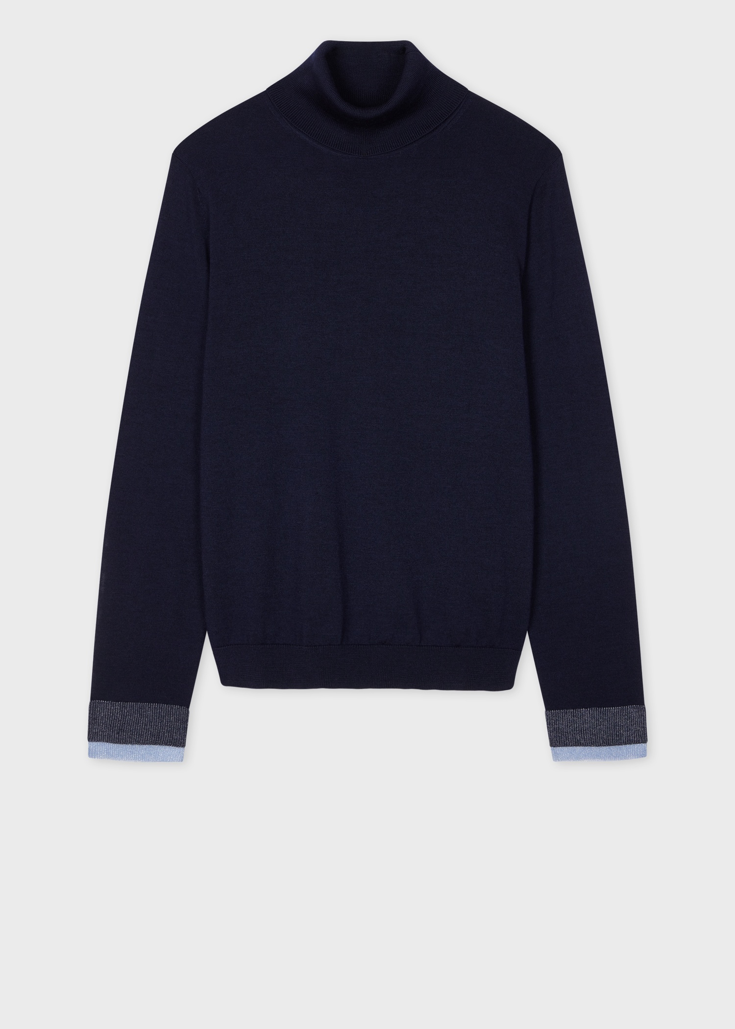 Made from a wool blend with a slight stretch this navy roll-neck sweater is constructed in lightweight knit. This sweater is complimented with a ribbed roll neck, a straight hem, and sleeve cuffs with contrast sheer trims infused with glitter thread. 97% Wool, 2% Nylon, 1% Polyester Hand Wash or Dry Clean Only The Fit Regular-Fit is relaxed through the body. Product Code: W2R-420N-N31241-49